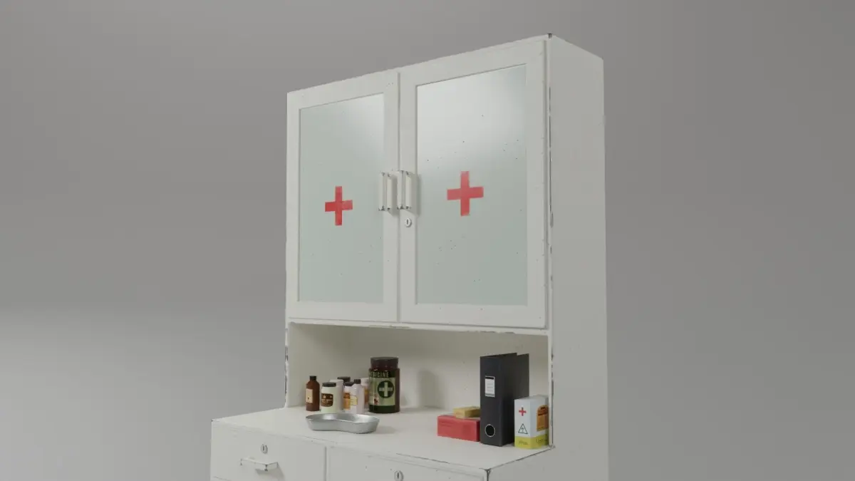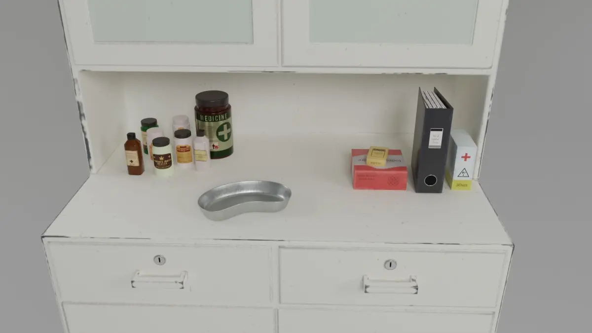 Assets: 1 cabinet, 1 binder, 1 bowl, 3 medicine boxes, 8 medicine bottles.