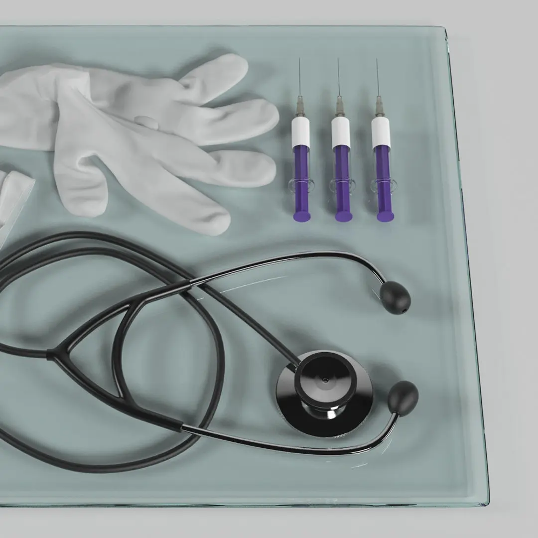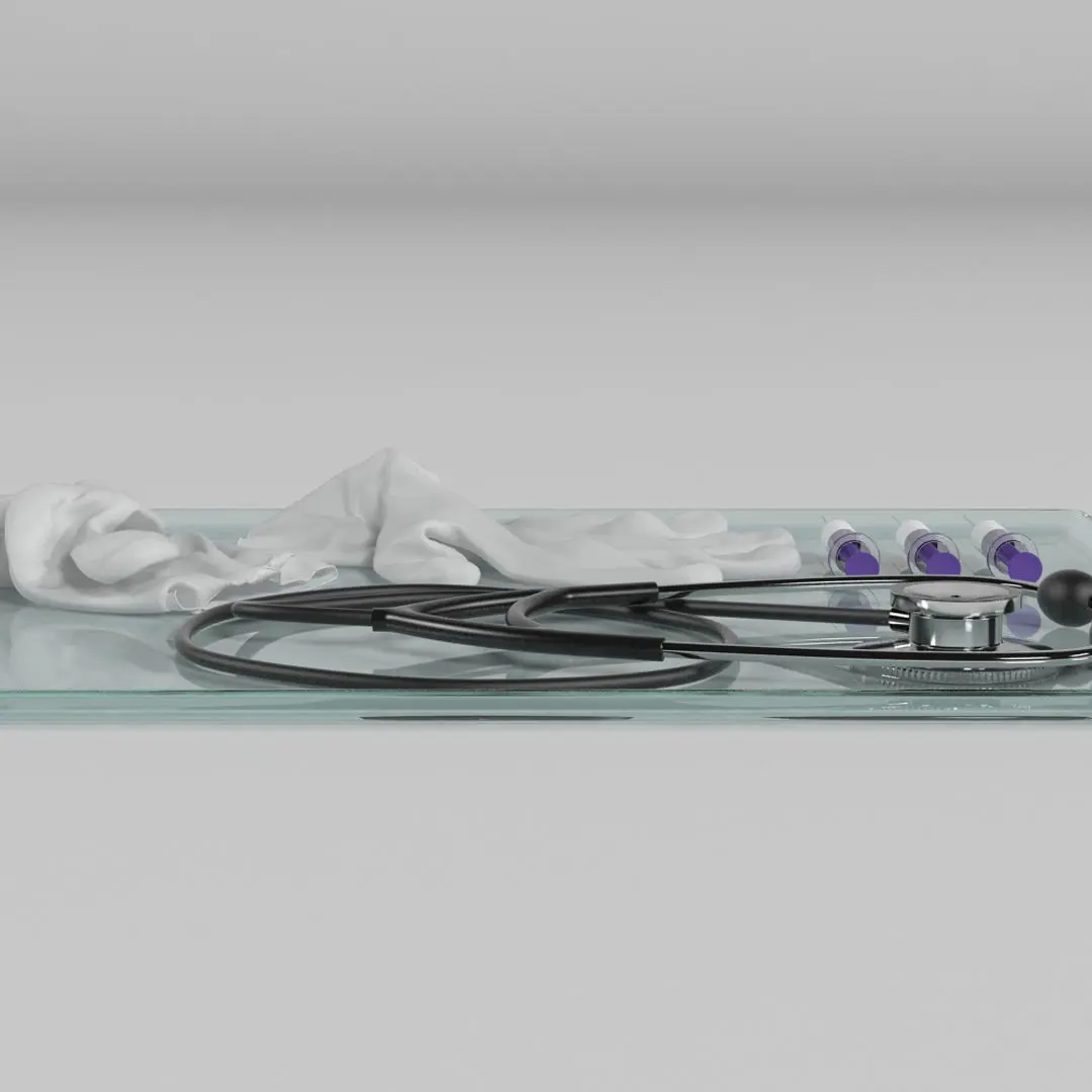 A DETAILED 3D MODEL OF A HOSPITAL TRAY AND EQUIPMENT;