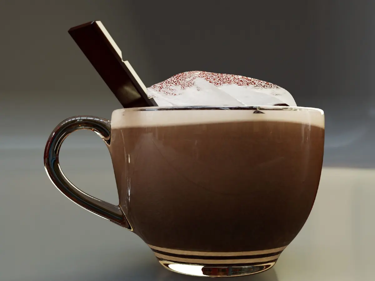 THIS MODEL CONTAINS:1 Large glass cup1 Hot chocolate model1 Chantilly model with cinnamon for decoration1 Mini chocolate bar for decoration1 Optional porcelain cup