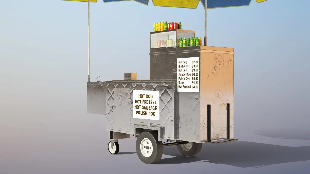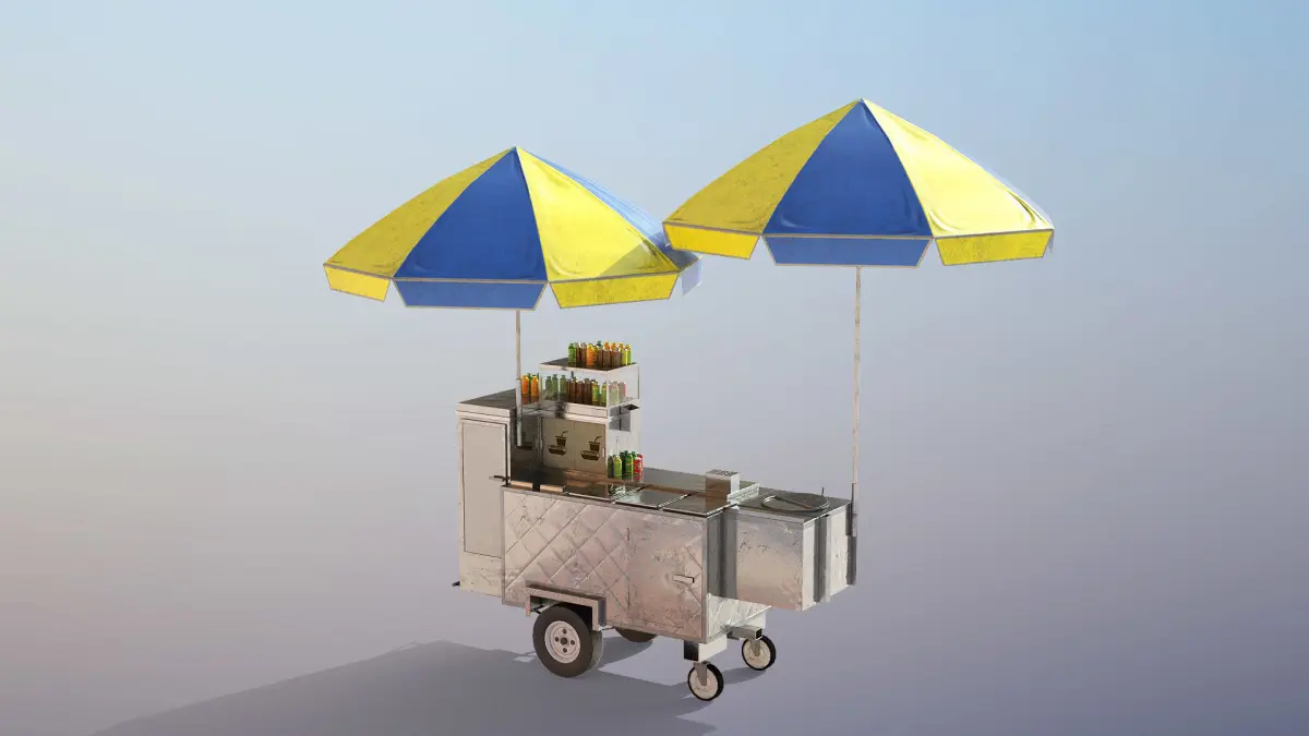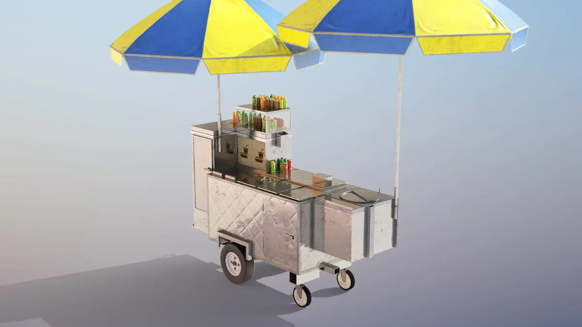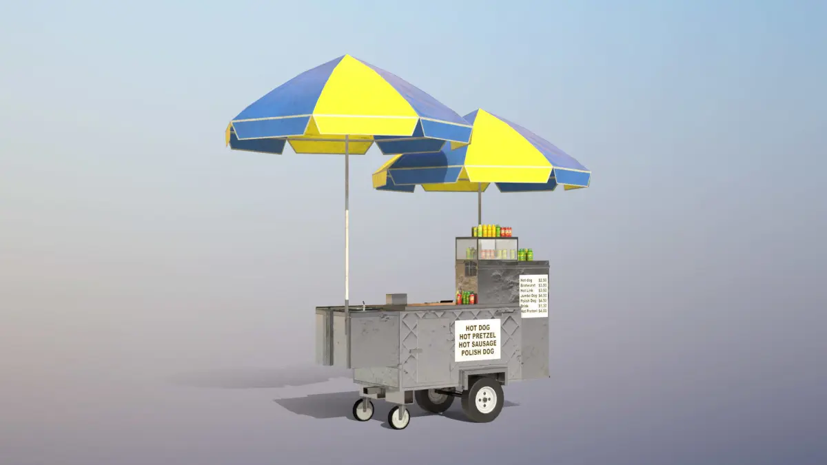 High-quality low-poly 3d model of Hot-Dog Cart with Umbrellas and some almost ready to eat food :)
