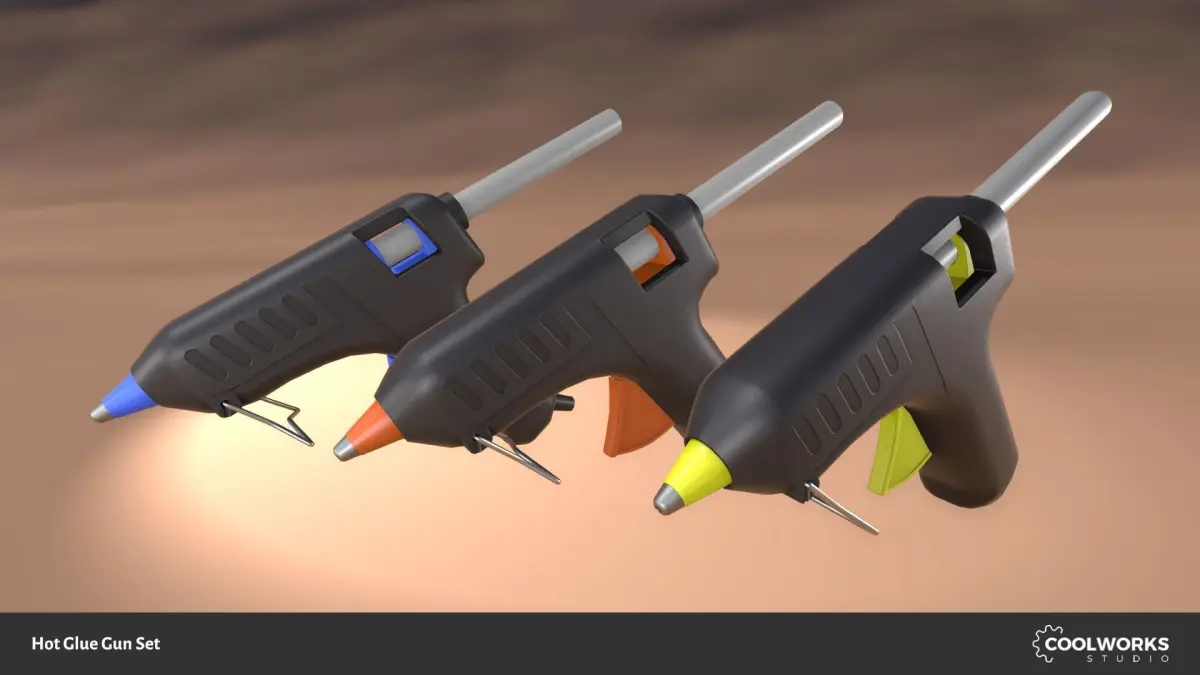 Set of detailed hot glue guns in blue, orange and yellow color, comes as a cordless assembly with separate glue stick, standing variant with a rolled cable and laid variant with a rolled cable – lowpoly PBR (specular and metalness) models. This product contains Unity package (version 2021.3) with all prefabs in PBR metalness + specular and a separate archive with assets and Blender (EEVEE) file.