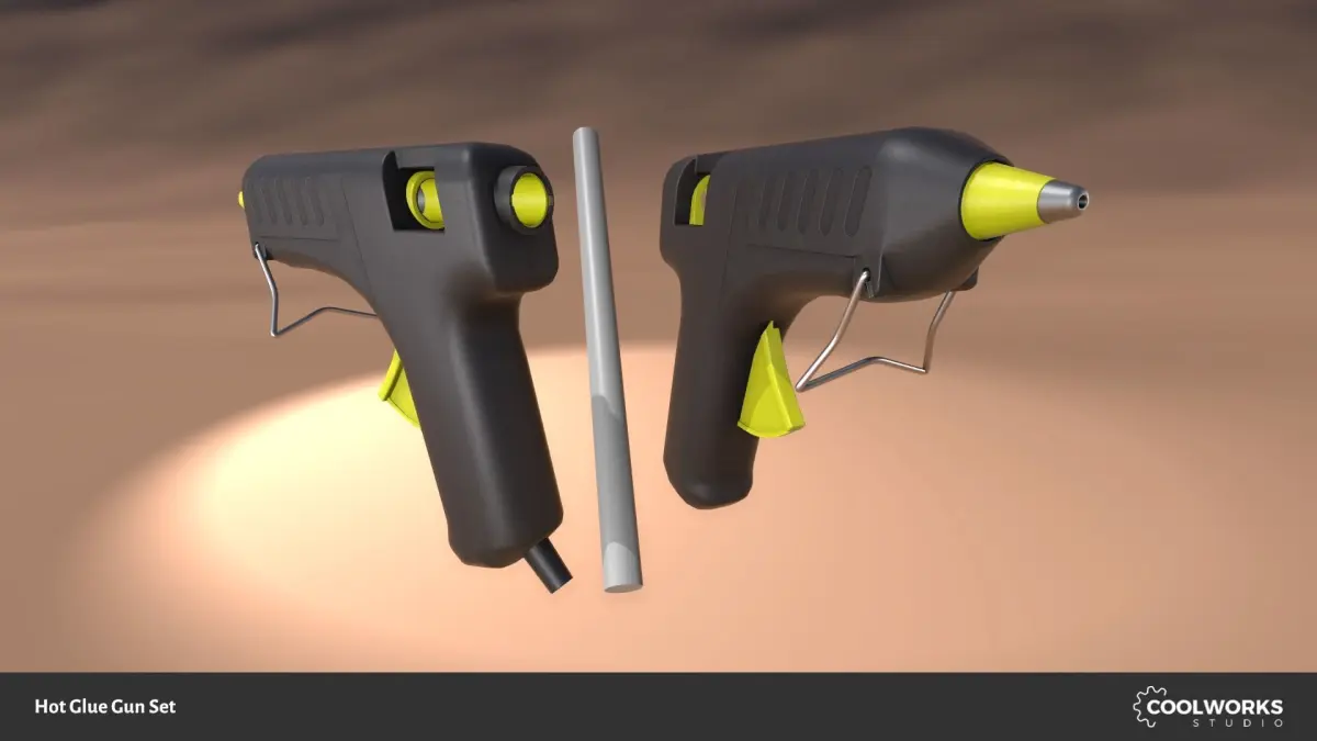 This package contains six glue gun meshes and one glue stick mesh in FBX format, PBR (specular and metalness) materials and related high resolution textures (4096 x 4096 pixels) – Albedo – specular, Albedo – metalness, Ambient Oclussion, Smoothness, Specular, Metalness and Normal map.