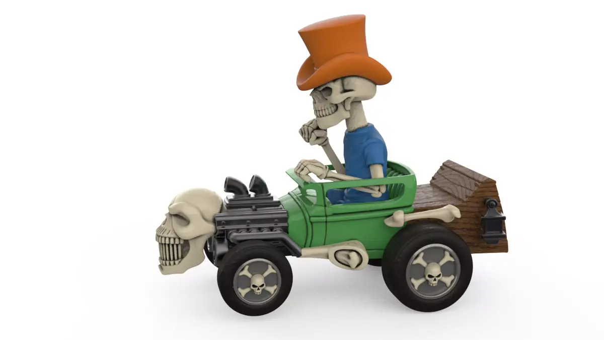 Unleash the Ghoulish Gearhead! This highly detailed, print-ready STL file set brings a bone-rattling hot rod driver right to your 3D printer. Featuring a grinning skeleton in a snappy top hat and a classic green rod with a terrifying skull engine block.Key Features & Facts: