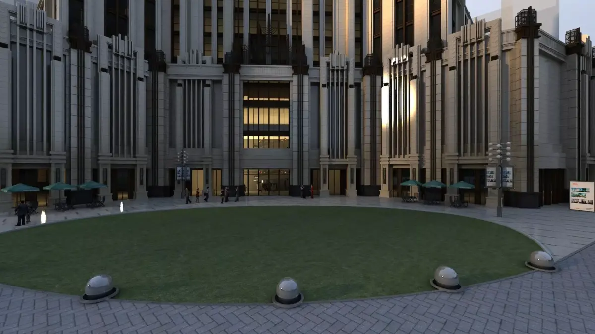 Hotel/headquarters building exterior. Plants are vr-mesh (9 files).