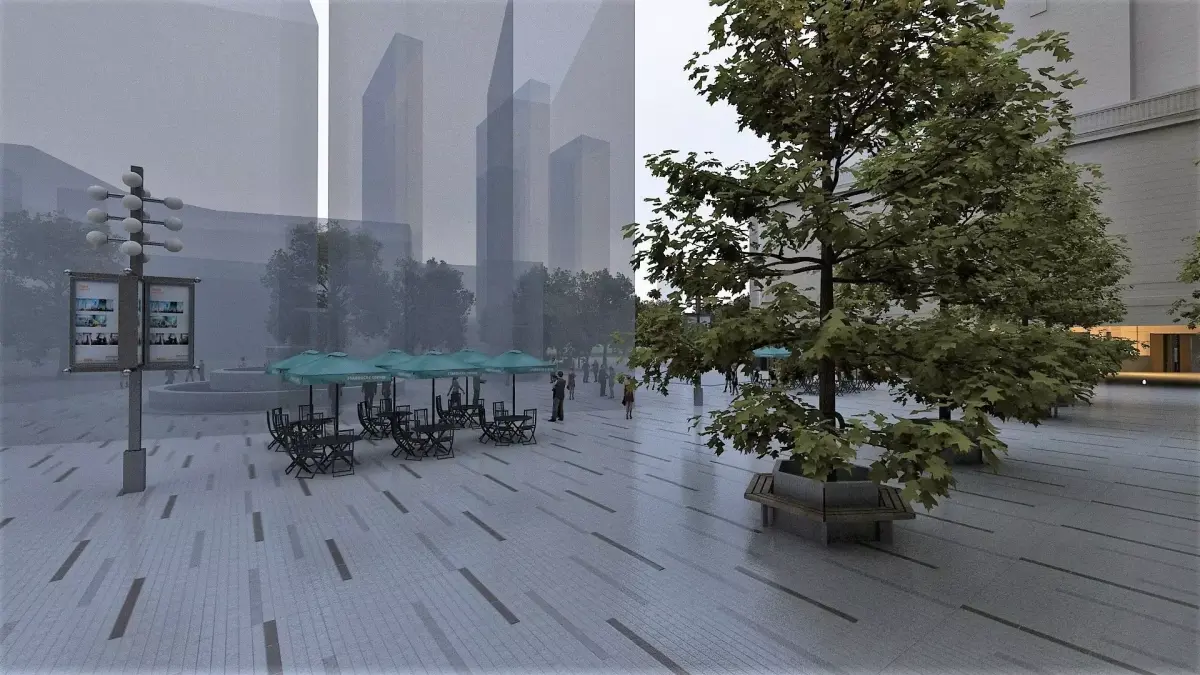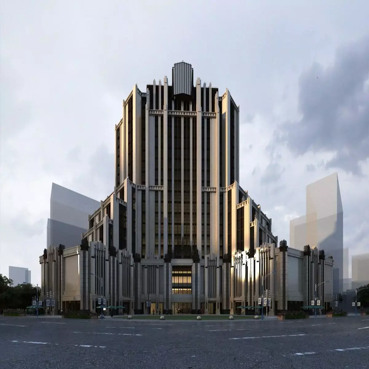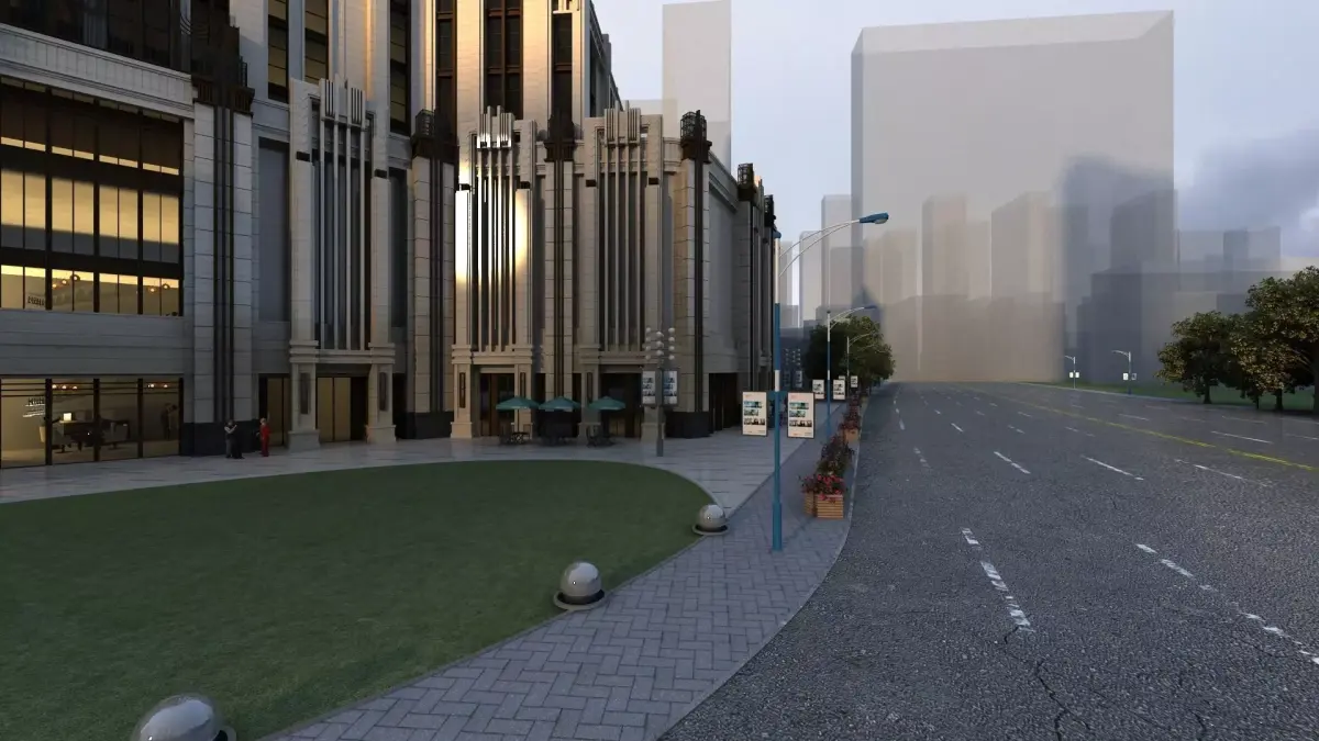 Hotel/headquarters building exterior. Plants are vr-mesh (9 files).