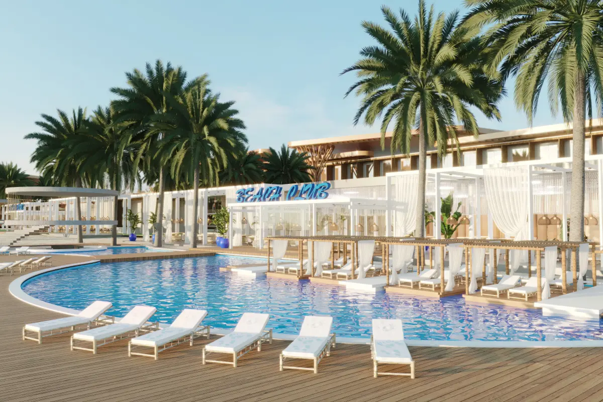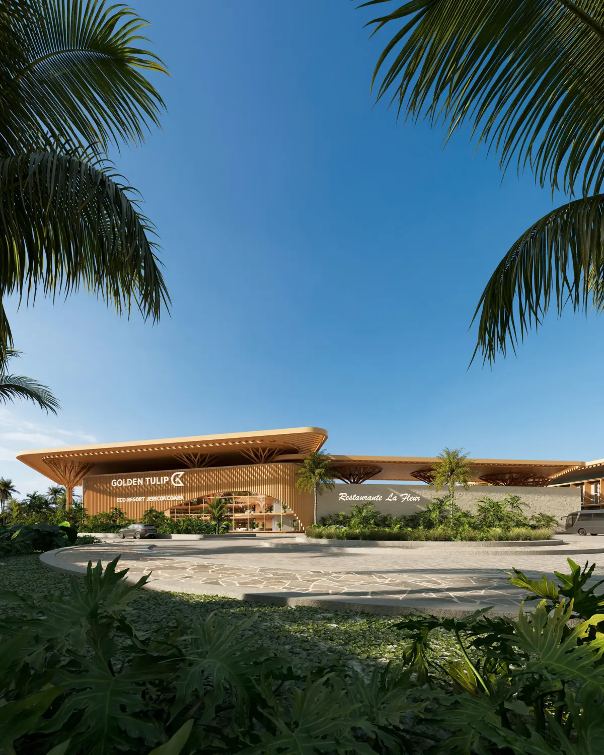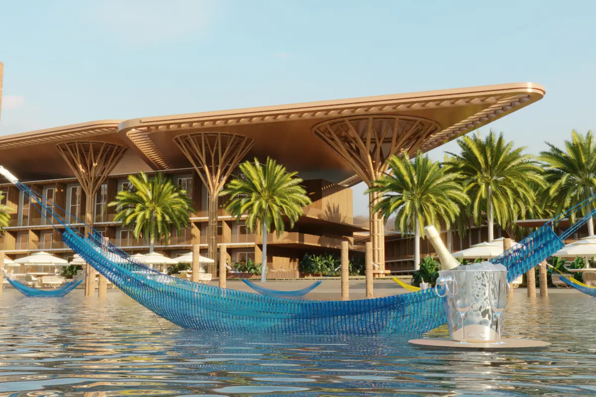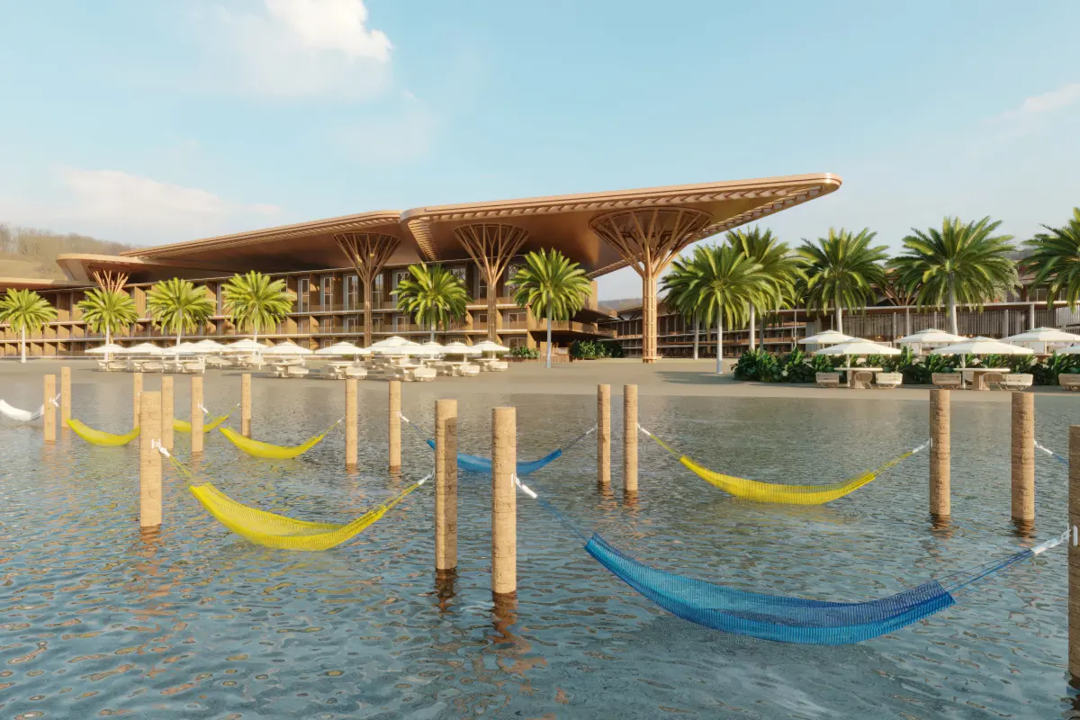 hotel de luxo na praia com arquitetura moderna toda em madeira, com piscinas e bares