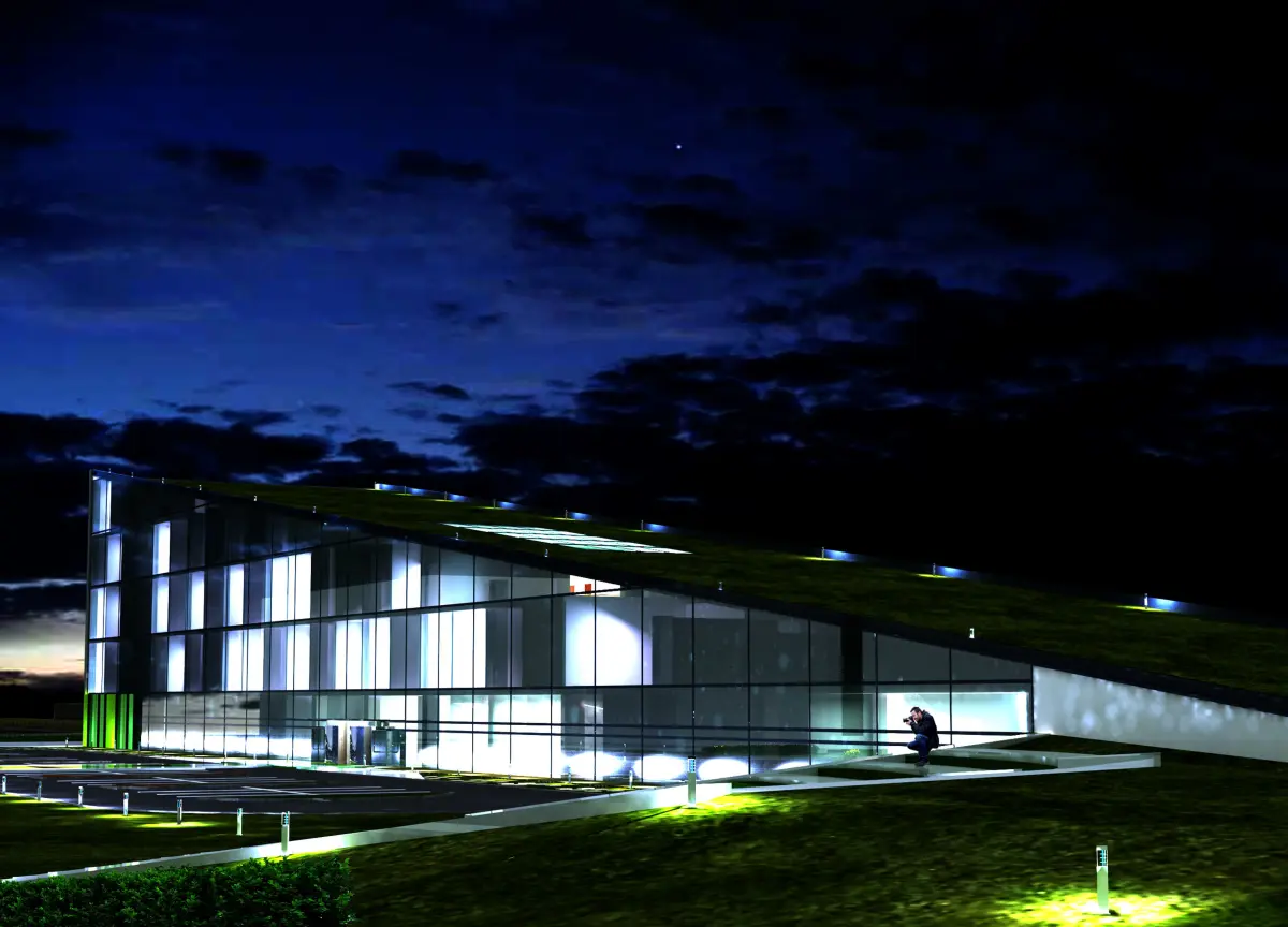 Project idea and main assumptionsThe idea of the project was to create a hotel-like facility using the camouflage technique, so that the facility would not be a dominant feature of the area, but would blend seamlessly into the landscape of Zabłocie and its green boulevards.This building should be simple, functional and attract the attention of potential customers.The hotel's volume is intended to blend in with the surroundings, and its transparent facades aim to create an atmosphere of connection with nature by connecting the hotel's interior with the riverside surroundings.The priority of the hotel in Krakow, where landscape elements are used in its structure, is functionality and an environmentally friendly approach in the context of internal-external relations.