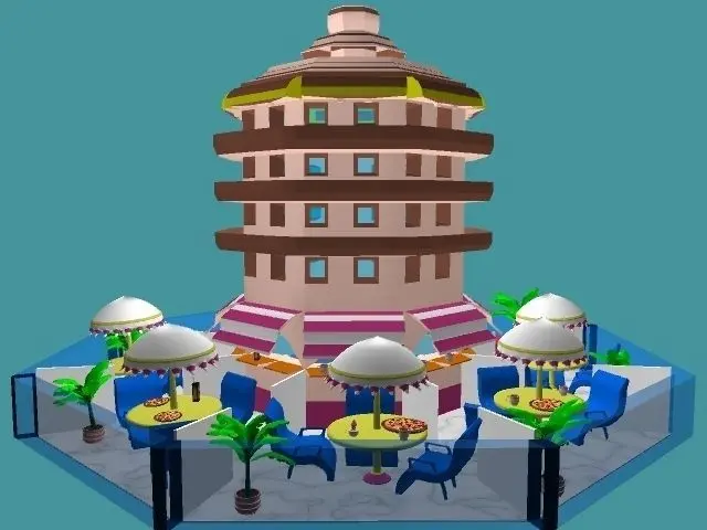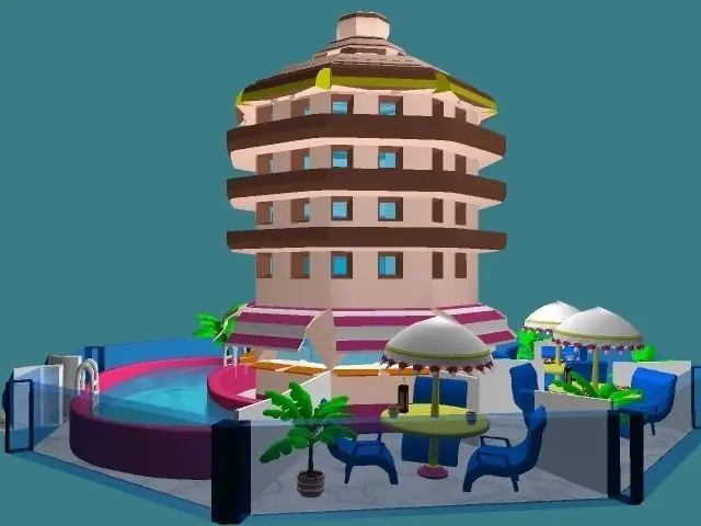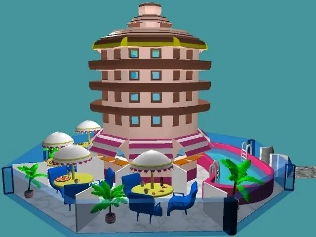 a HOTEL Maquette model from the 1- exterior look 2- interior look 3- Landscape 4- Backyard