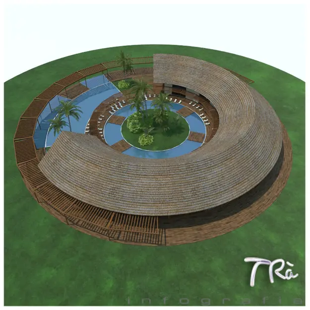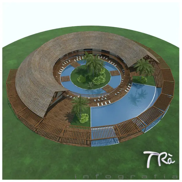 Detailed 3d model of the tropical beach club Hotel Reception and exterior pool resort