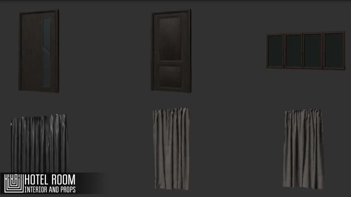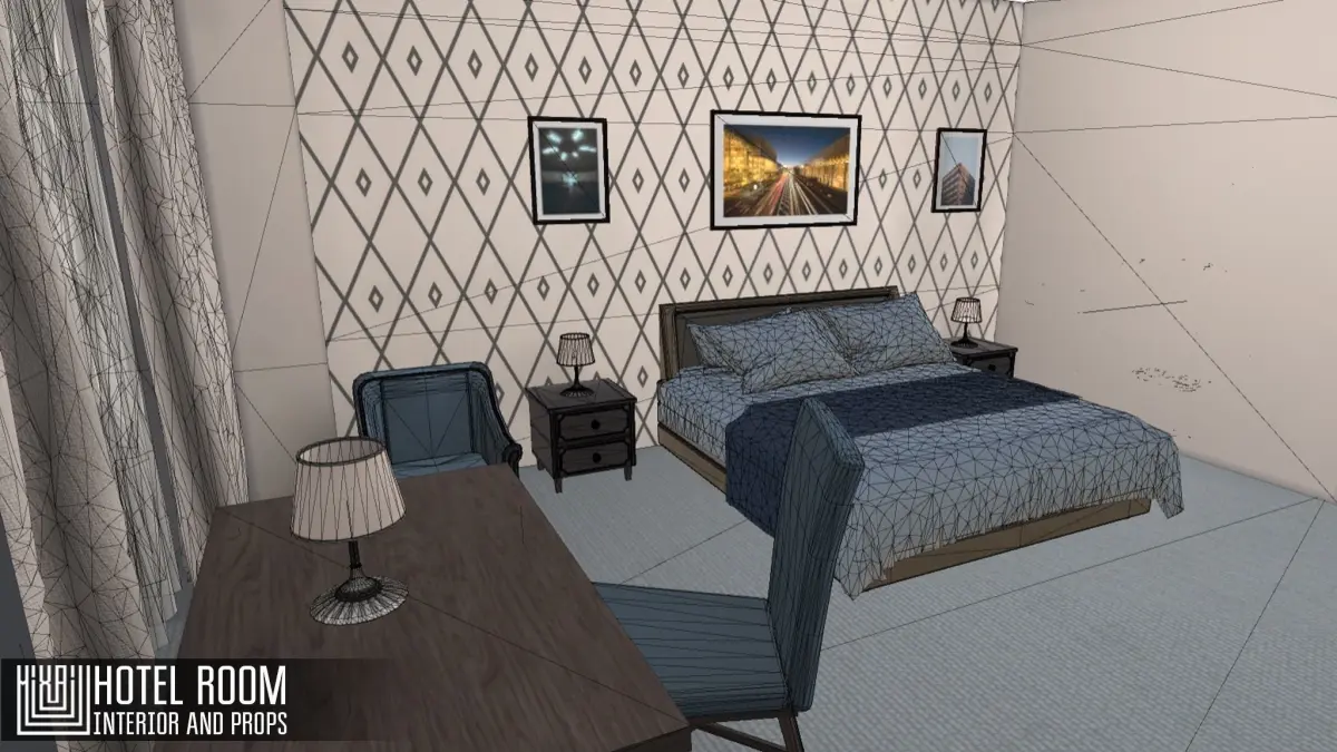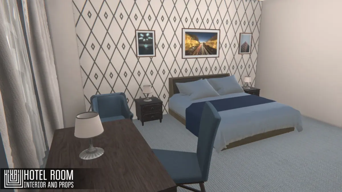 Mixaill studio presents a good solution for your games, VR projects and simulators.Hotel room its room and props, household appliances, interior items that will help you save time on implementing your ideas.There is a ready-made scene for the Unity and Unreal enginesPack includes a large set of necessary models:Room 900 trisBed 9.5k trisWardrobe 8.2k trisTV 300 trisDoor 1.2k trisDrawer 7.1k trisBath 4.9k trisWC 2k trisLamp 2.2k trisArmchair 3k trisWindow 2.5k trisCurtain 5.1k trisPicturesSink 4k trisChair 1k trisTowel 6.4k tris