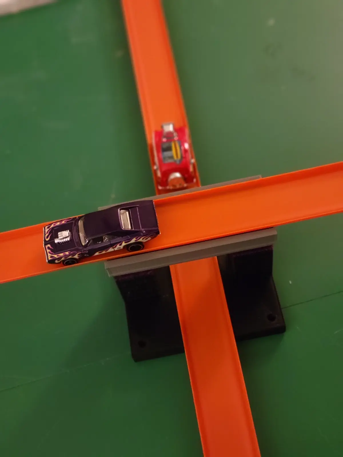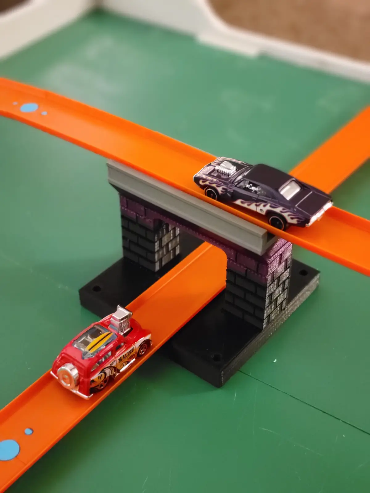 This overpass works with HotWheels Track Builder tracks. The tracks easily slide on and are held firm. We printed this using 50% infill so it is strong enough for a child to play with without easily getting damaged. In the pictures you can see we printed this with three different filament colors to give it an interesting look. We used PLA plastic for this print.