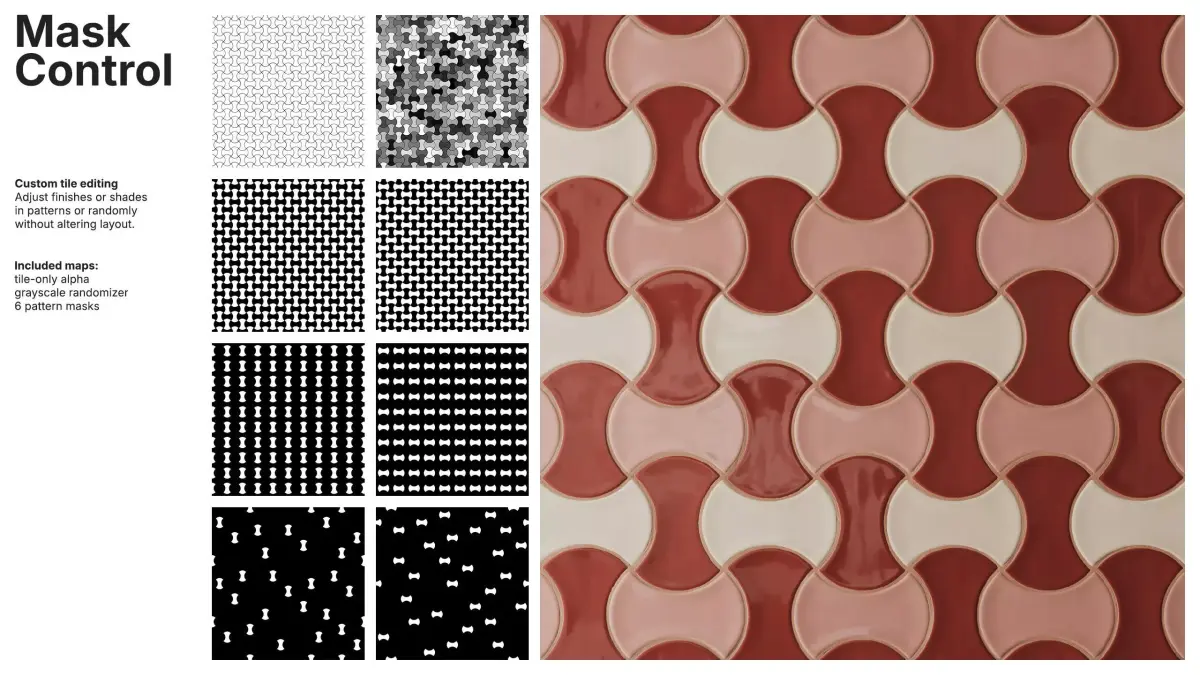 Pattern and random masks allow independent control of tile and grout colors, enabling global, per-pattern or per-tile adjustments without disturbing the layout. Tile-only alpha, a grayscale randomizer and pattern masks ensure full customization for complex designs.