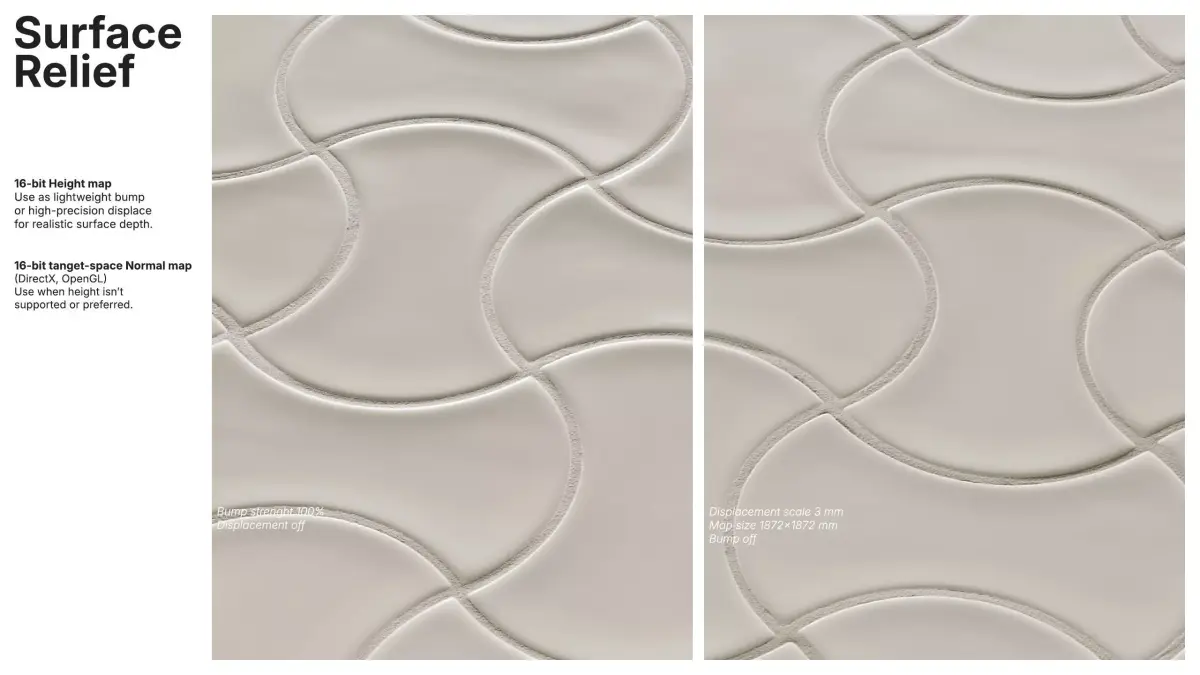 Surface relief is provided by a RAW 16-bit height map tuned for a true 3 mm depth (1872x1872 mm surface), suitable for lightweight bump or precise displacement. A 16-bit tangent-space normal map (DirectX/OpenGL) is included for cases where height-based workflows aren’t preferred.