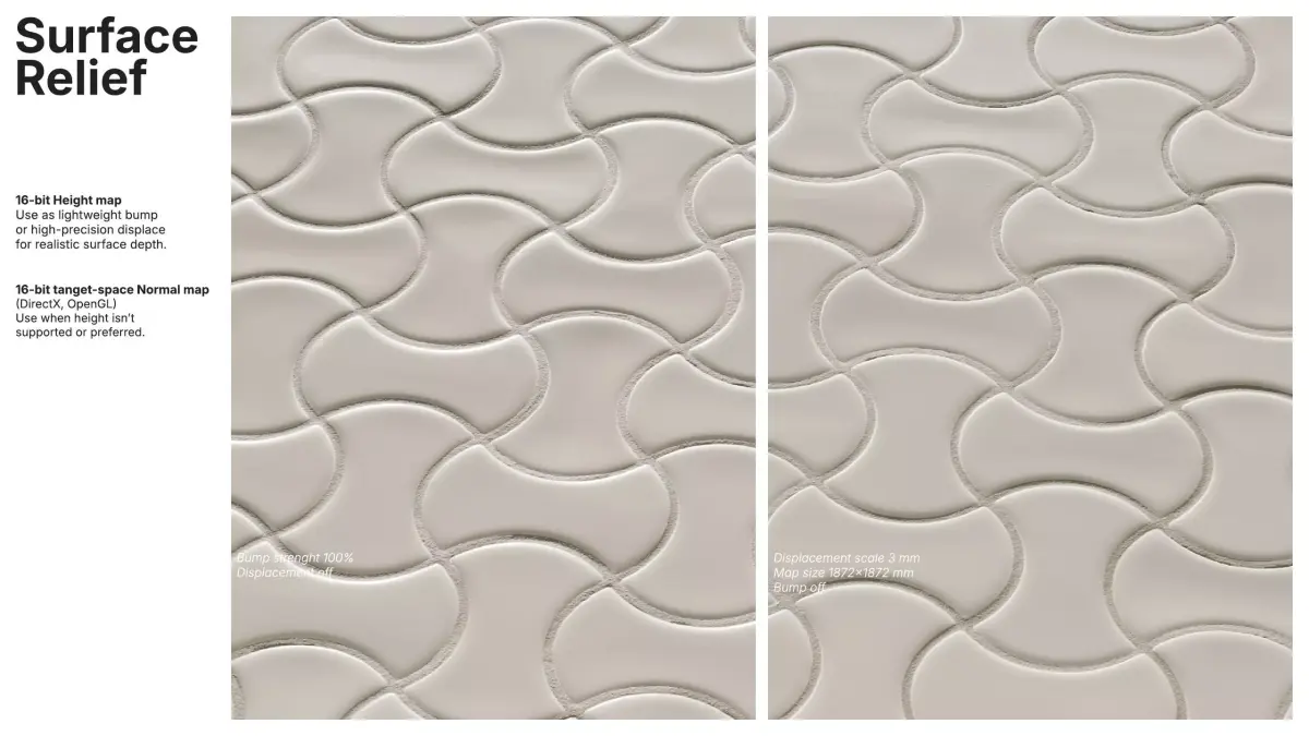 Surface relief is provided by a RAW 16-bit height map tuned for a true 3 mm depth (1872x1872 mm surface), suitable for lightweight bump or precise displacement. A 16-bit tangent-space normal map (DirectX/OpenGL) is included for cases where height-based workflows aren’t preferred.
