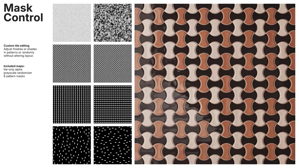 Pattern and random masks allow independent control of tile and grout colors, enabling global, per-pattern or per-tile adjustments without disturbing the layout. Tile-only alpha, a grayscale randomizer and pattern masks ensure full customization for complex designs.