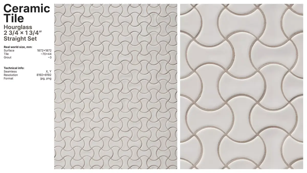 Glazed artisan ceramic tile material in a hourglass 2 3/4 x 1 3/4" format arranged in a straight set layout.