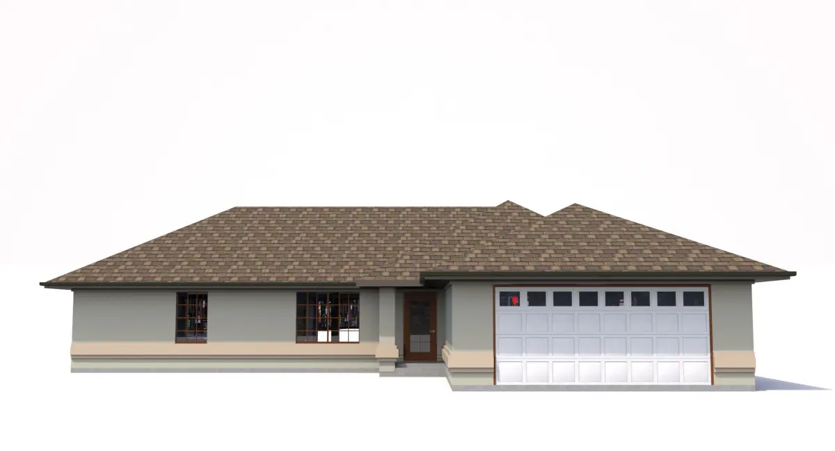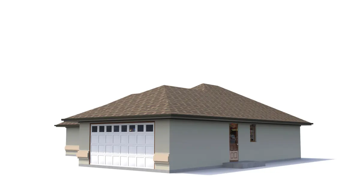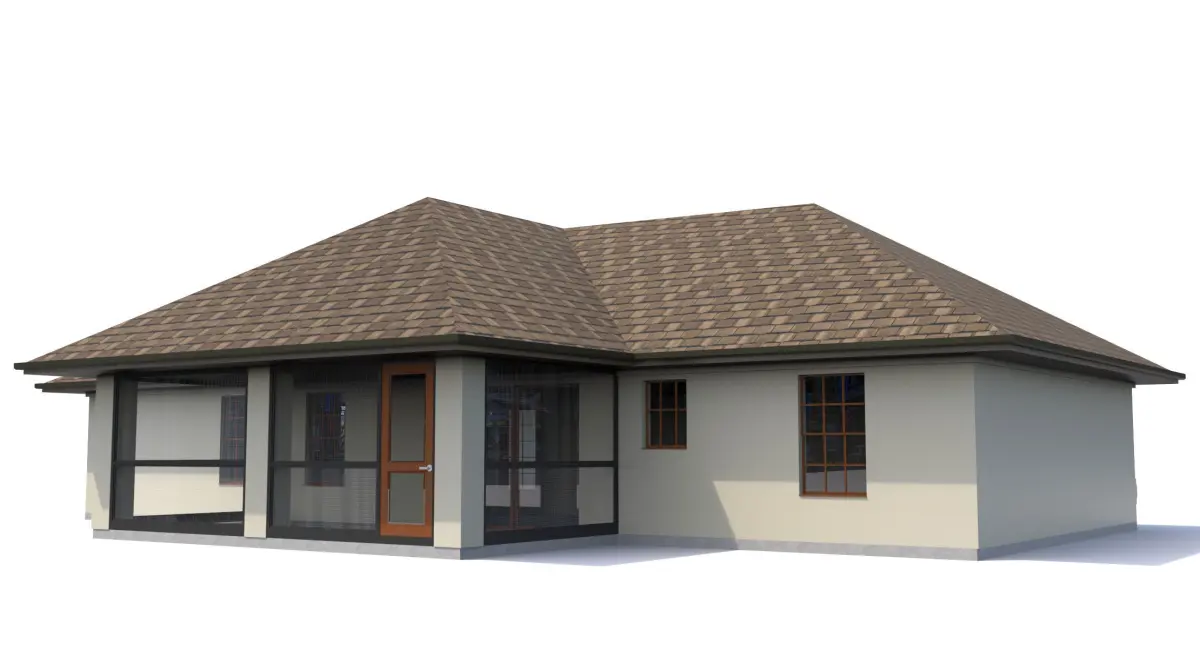 Custom Home,1 story with attached garage,Low Poly:about 3,300 SF footprint-Exterior material is Stucco with Stucco profiles, wood windows and doors, and rear screened and roofed patio area, patio area screen is a mesh.-Stucco finish has concrete bump map for up close renderings