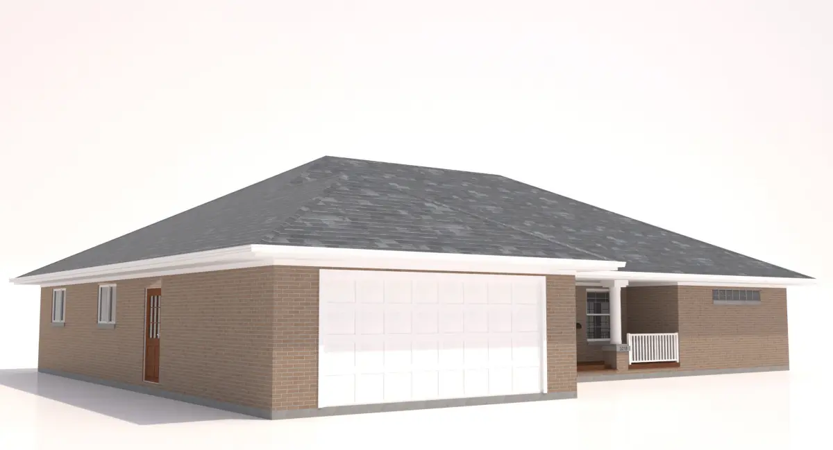 1 story Home w. Red Brick and garage. Patio area and Columns in Front.Low Poly High Detail model