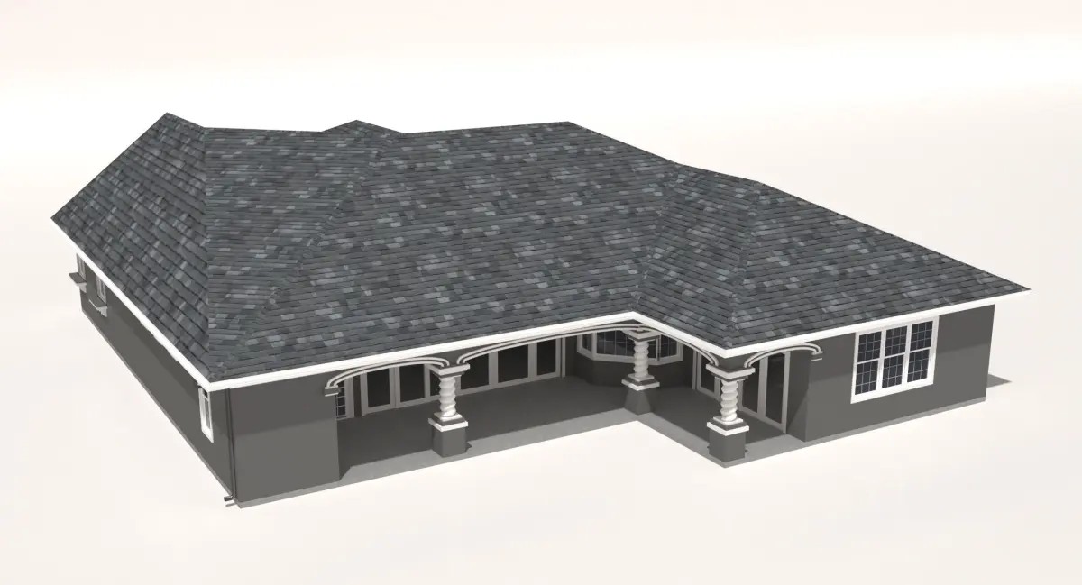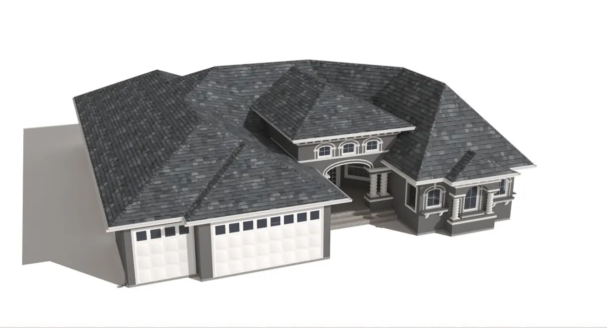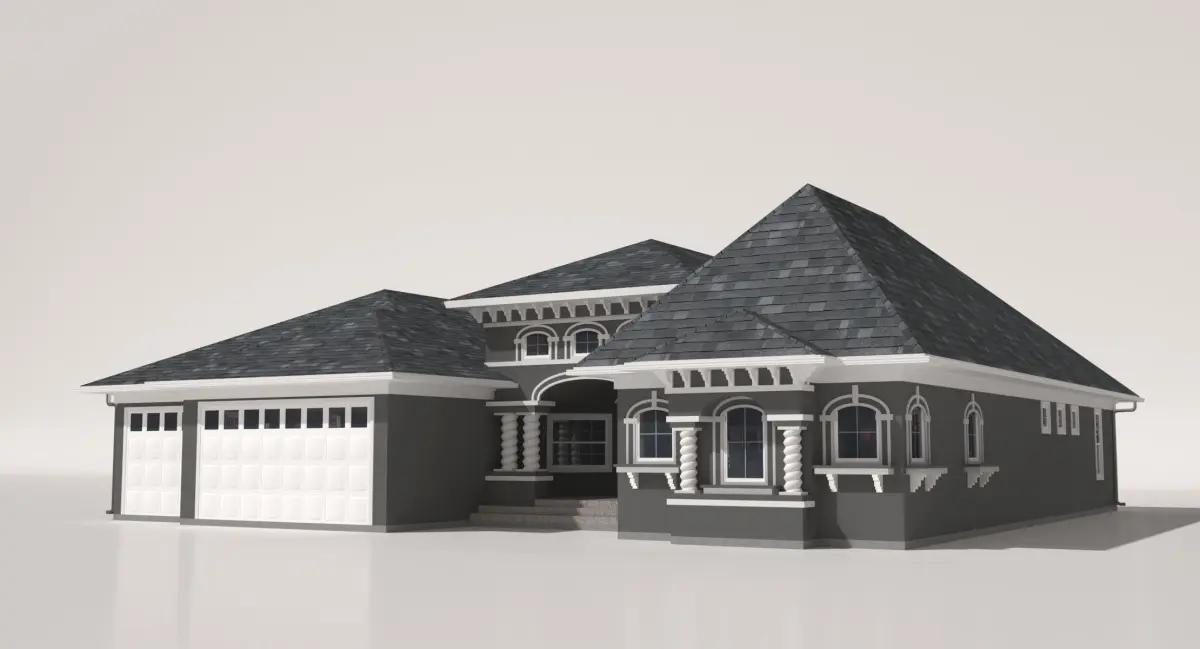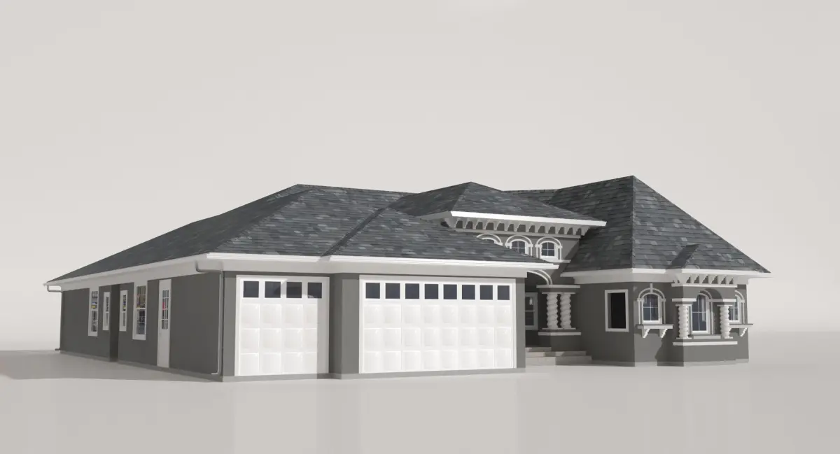 1 story Home w. Stucco and 2 attached garages.High Detail model w. Rounded columns and two tone stucco finish, ready for up close renderings