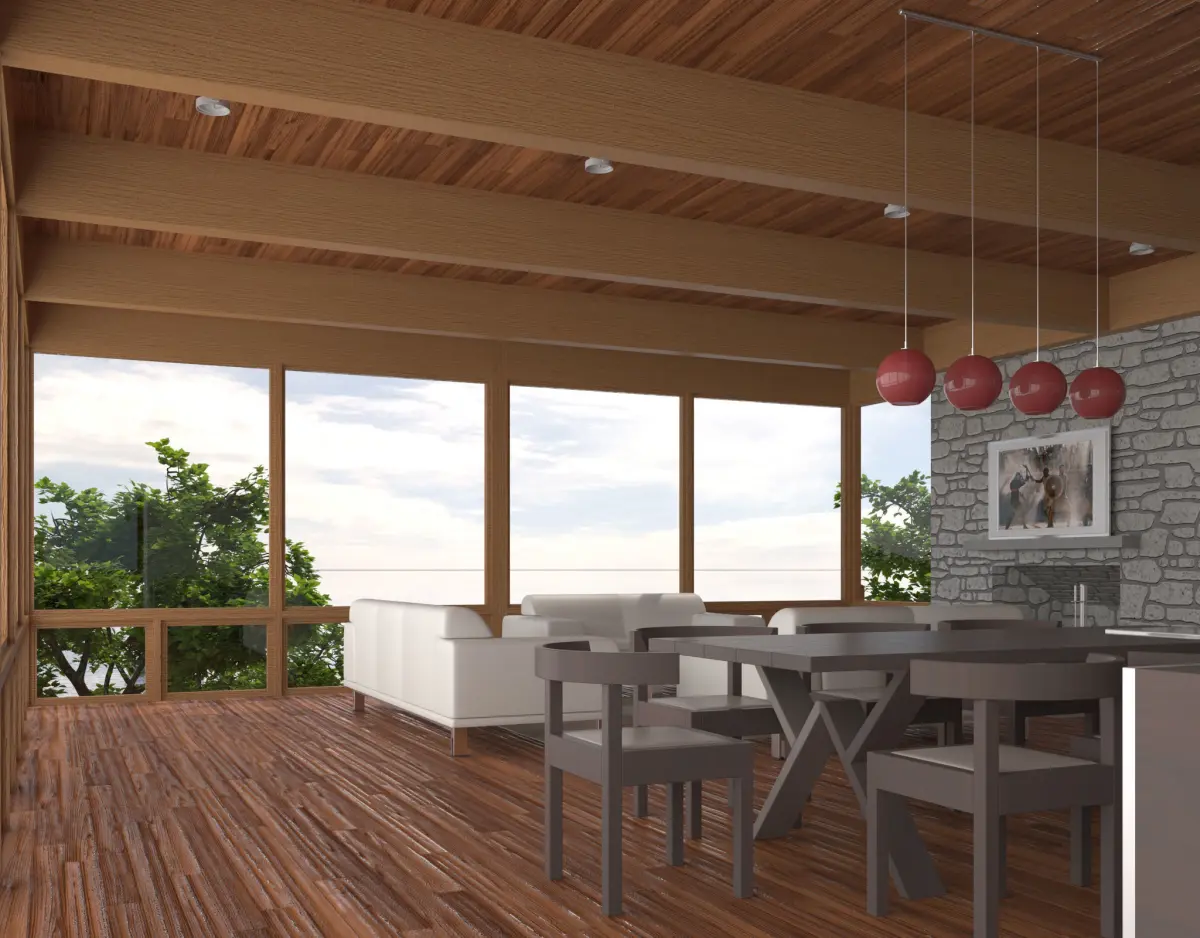 -Modeled in 3Ds Max 2015, rendered using Vray & HDRI Lights, HDRI Lights NOT included, Sky is from HDRI Light.-Model does NOT include interior furniture, equipment, fixtures, appliances, boats, trees, Those are shown only for purposes of displaying a furnished house.-Model includes: Structure, roof, windows, breezeway, chimney, walls, trim, door, baseboard, stairs, sloped site, water with with underlay, wood ceiling and floor, Kitchen Island(no appliances, counter top and Panels only)-All textures included in Zip File-All Objects grouped into 1 group for Easy scene movement, water is separate group and is hidden in model, Unhide All to un-hide water.-Objects named logically-Site with grass has Subdivide on and Displacement to make grass look more realistic, can be turned off on object for faster rendering but grass will look flat.-Water may need to be adjusted depending on scene and lighting.