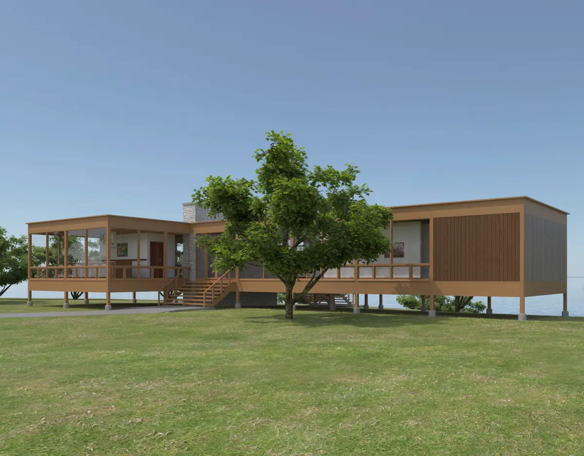 3D model of a Summer House Located along a lake on a steeply graded site.-House is wood construction on a bay grid. 1 Side is living quarter (living room, kitchen, powder room, closet), 2nd Side is the sleeping quarters with 3 bedrooms, 2 bedrooms with shared bathroom and 1 master bedroom with private bathroom. The two sides are split from each other by a open mesh breezeway.