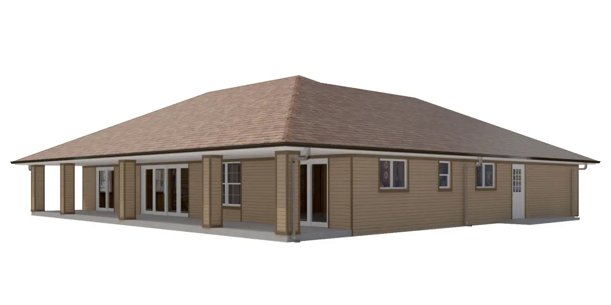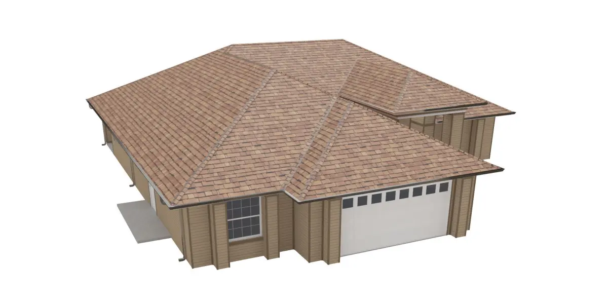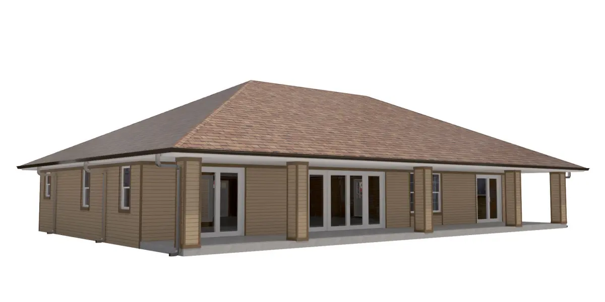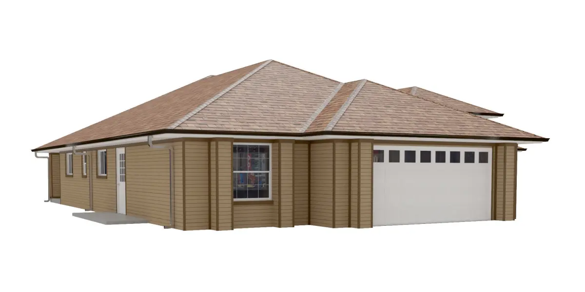 +/- 3,056 Square Foot 1 story Home w. Siding Exterior and 1 attached garages. House entry has Wood ceilingHigh Detail Exterior Model including doors and windows.-House includes Rear porch with concrete floor