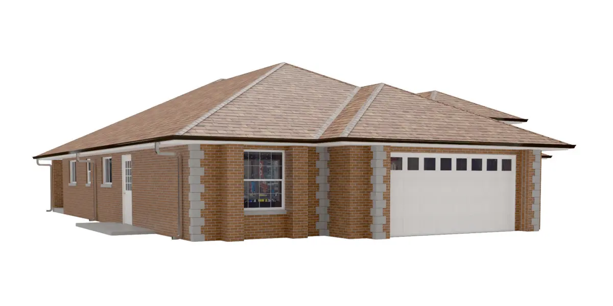 -Set to 0,0,0 Axis -All objects grouped into a single group for easy scene movement.-Wood, concrete, brick,shingles, textures included. -Glass is reflective so you dont see inside as much-Gutters and Downspouts included.-Great house for any infill scene-Low Poly.