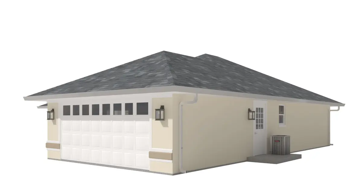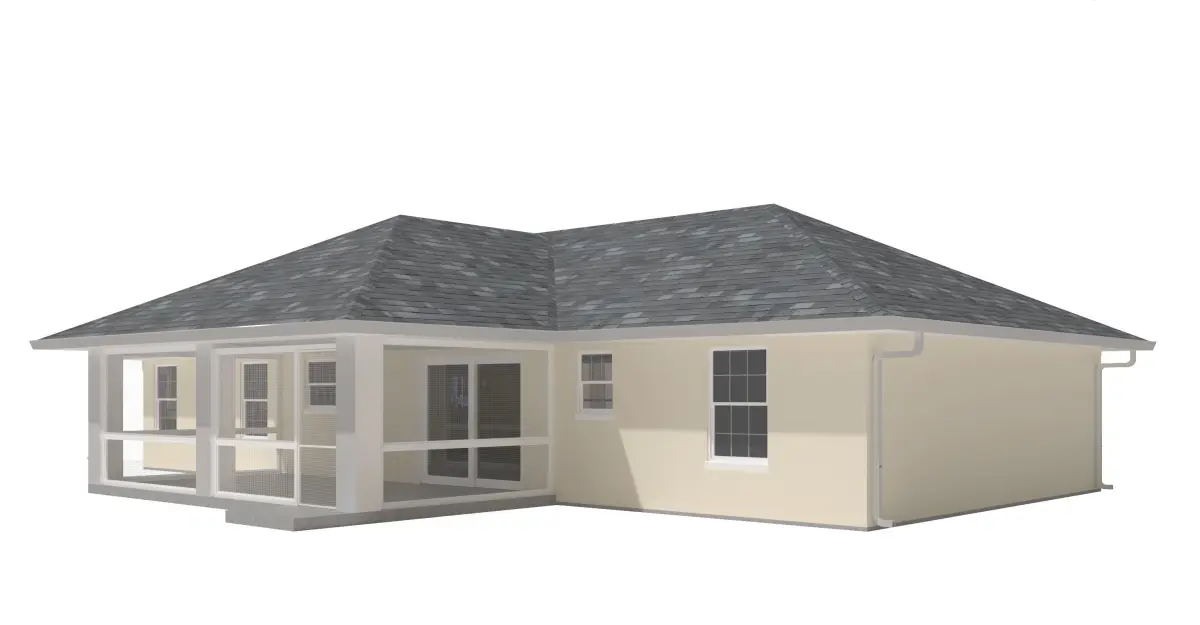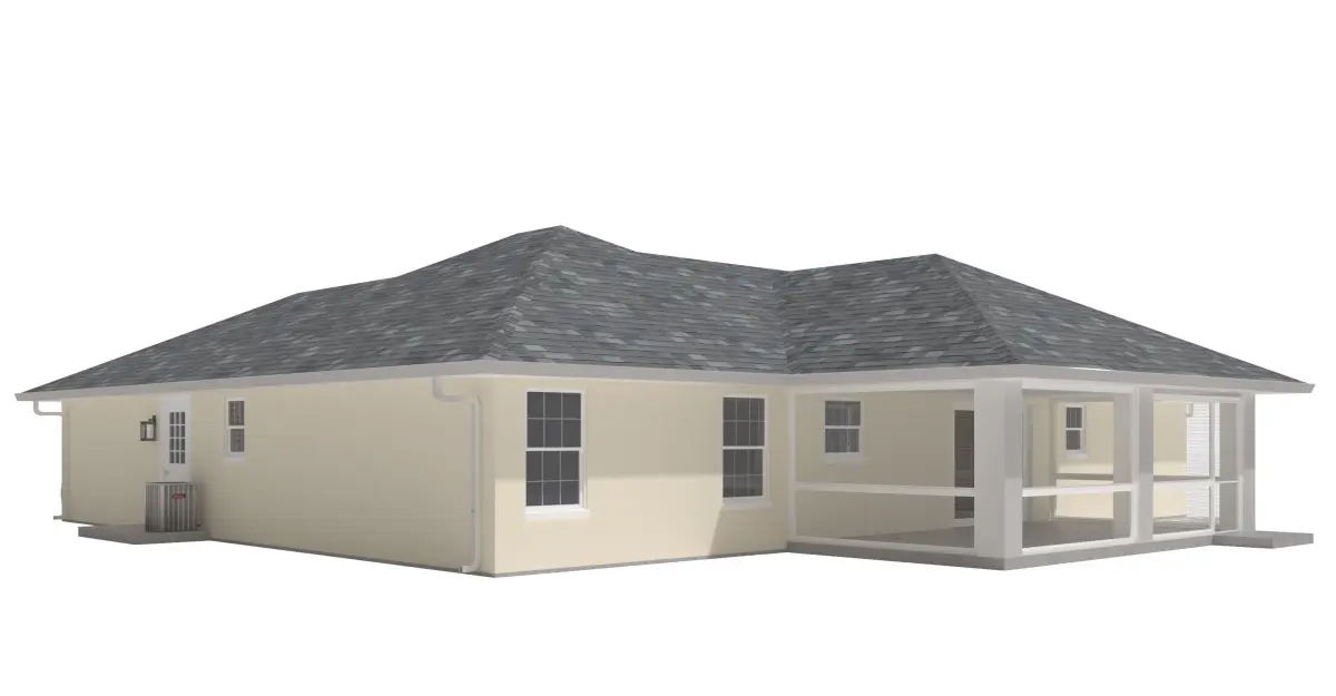 +/- 2,000 Square Foot 1 story Home w. Stucco Exterior and 1 attached garages. High Detail Exterior Model including doors and windows.-House includes Rear porch with concrete floor and areas screened in with wire mesh netting.