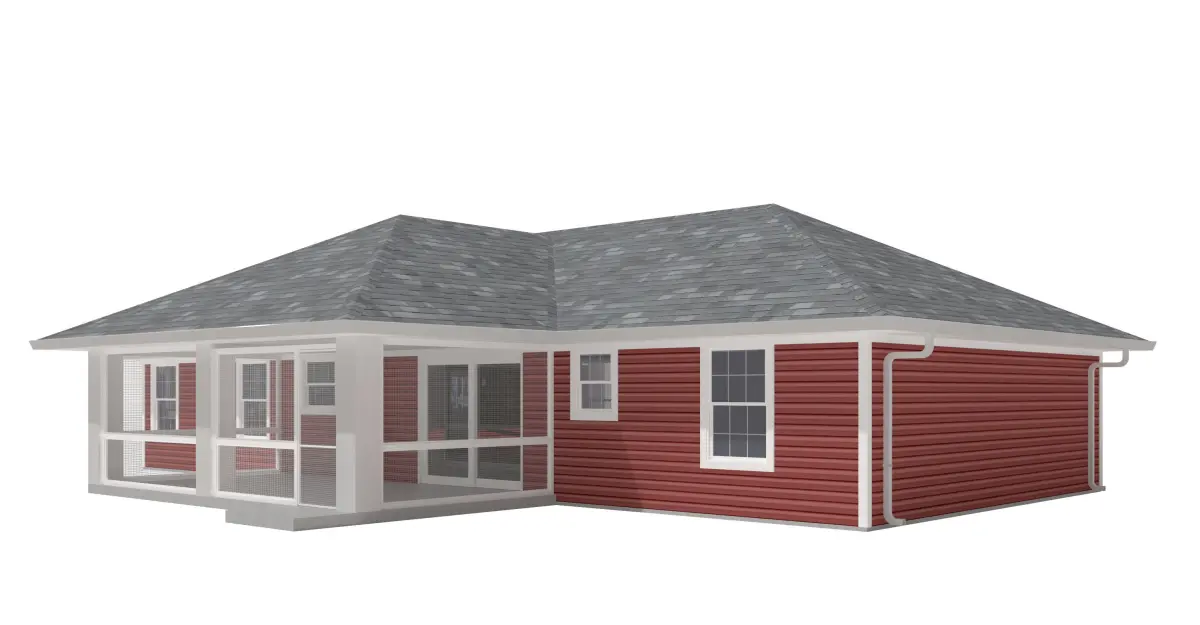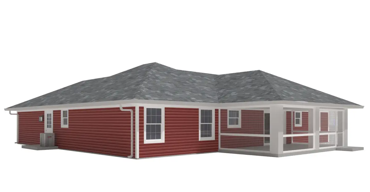 +/- 2,000 Square Foot 1 story Home w. Red Siding and White Trim and 1 attached garage. High Detail Exterior Model including doors and windows.-House includes Rear porch with concrete floor and areas screened in with wire mesh netting.