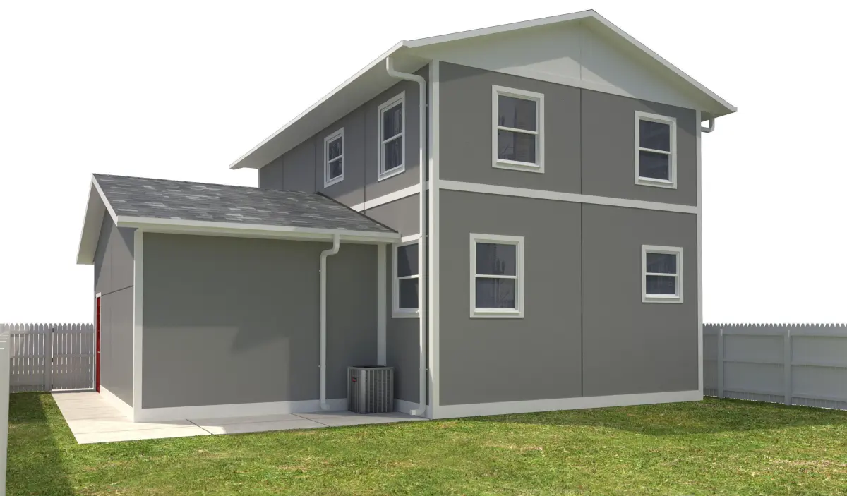 +/- 1,400 Square Foot 2 story Home with +/- 300Sf garage. House is shown with Gray and White Stucco or Eifs .High Detail Exterior Model including doors and windows. Interior is NOT modeled. House also incldues entire site, including yard, sidewalks, fence, driveway, curb and curb cut, grass. This house will be part of a series that will make up an entire city block.