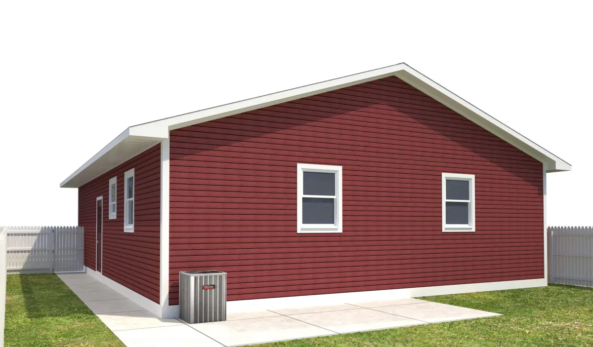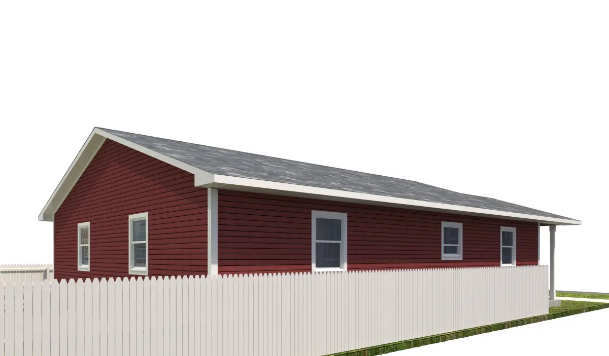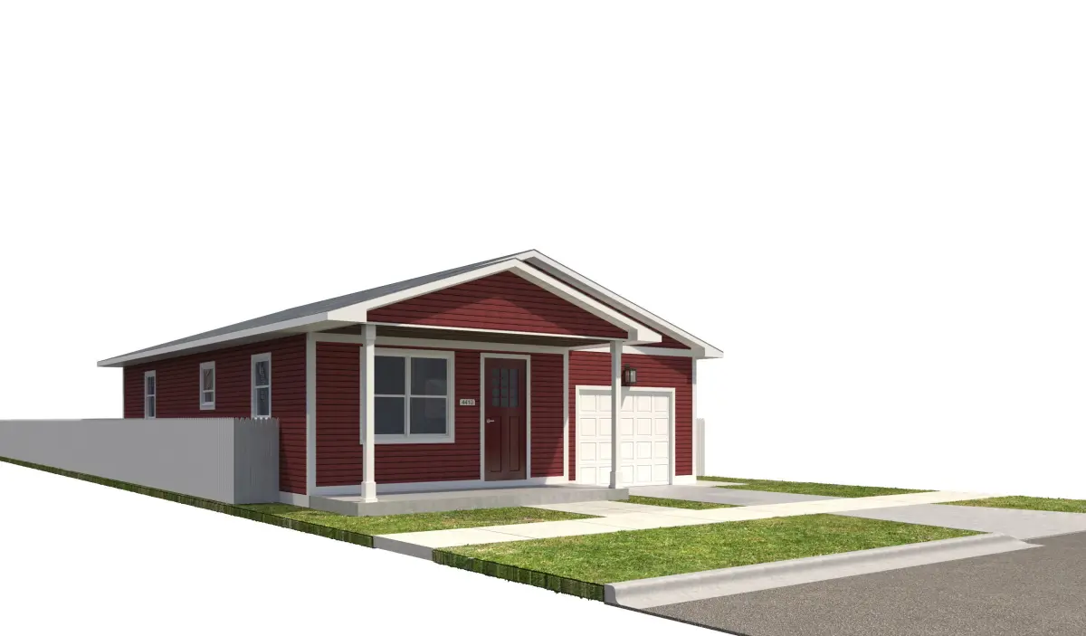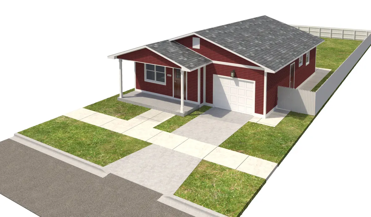 +/- 1,280 Square Foot 1 story Home with attached garage. Red Horizontal Siding With White Trim .High Detail Exterior Model including doors and windows. Interior is NOT modeled. House also incldues entire site, including yard, sidewalks, fence, driveway, curb and curb cut, grass. This house will be part of a series that will make up an entire city block.