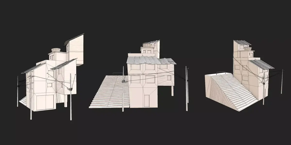 This asset represents a detailed section of the full Favela scene, which can be seen in the preview images. It's a fragment of a larger environment, making it perfect for modular level design or environment set dressing.