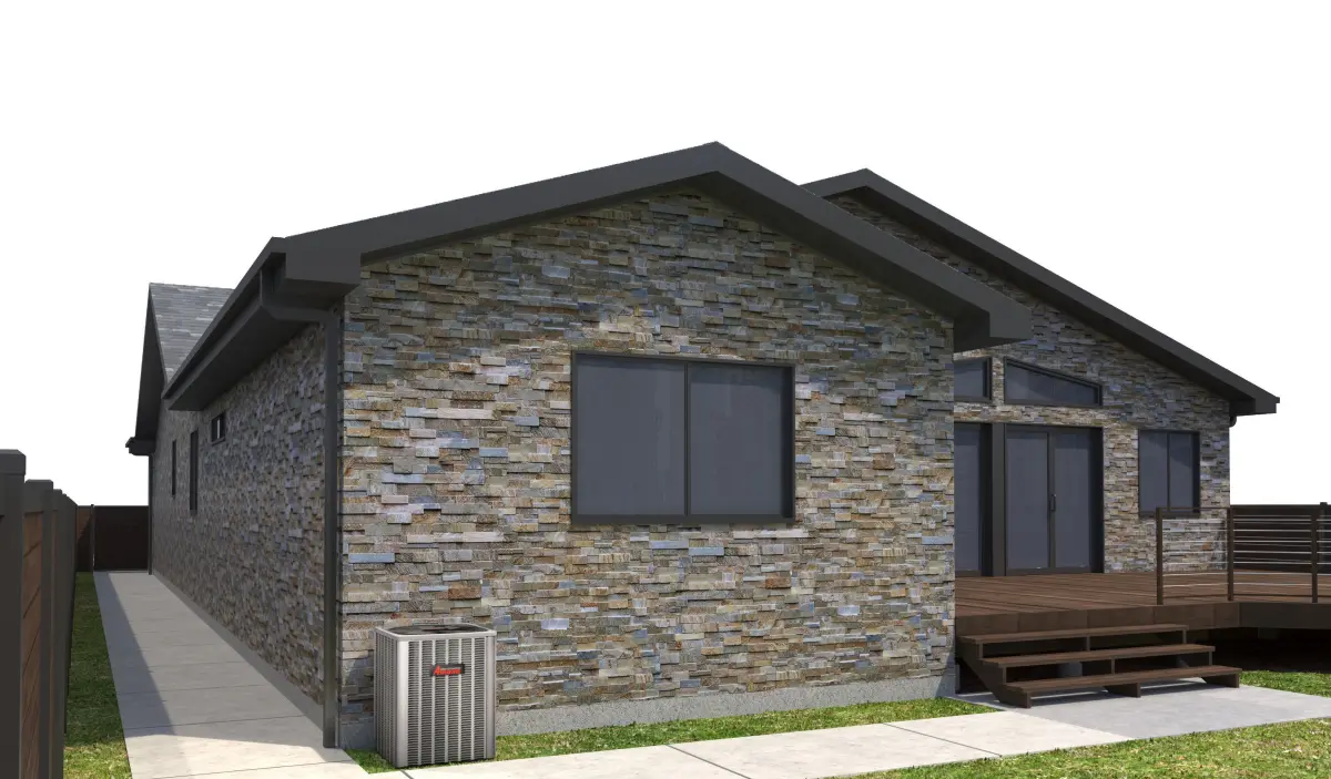 - +/- 2,835 Square Foot 1 story Home with a Garage . House has Stone Exterior Walls with Stone Trim Details. Black Window Frames, Red Doors. Property has a Dark Wood fence. House has a deck in the yard. House also incldues air vents on roof.