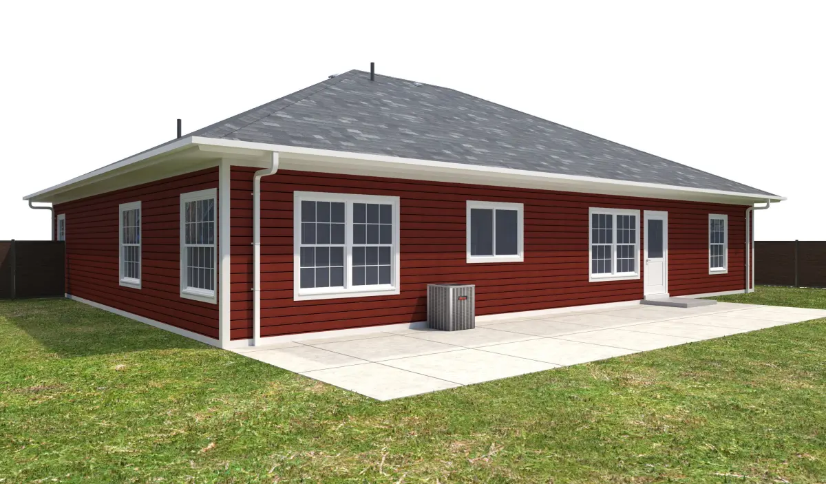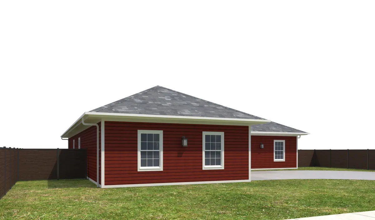 - +/- 2,964 Square Foot 1 story Home with dual door Garage . House has Red Siding Exterior Walls, White Window Frames, and White Doors. Property has a Dark Wood fence, Dark garage doors and Roof Posts at Entry. Entry Ceiling below roof has wood panels.