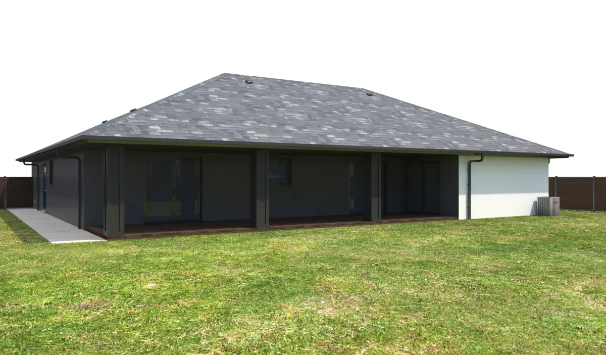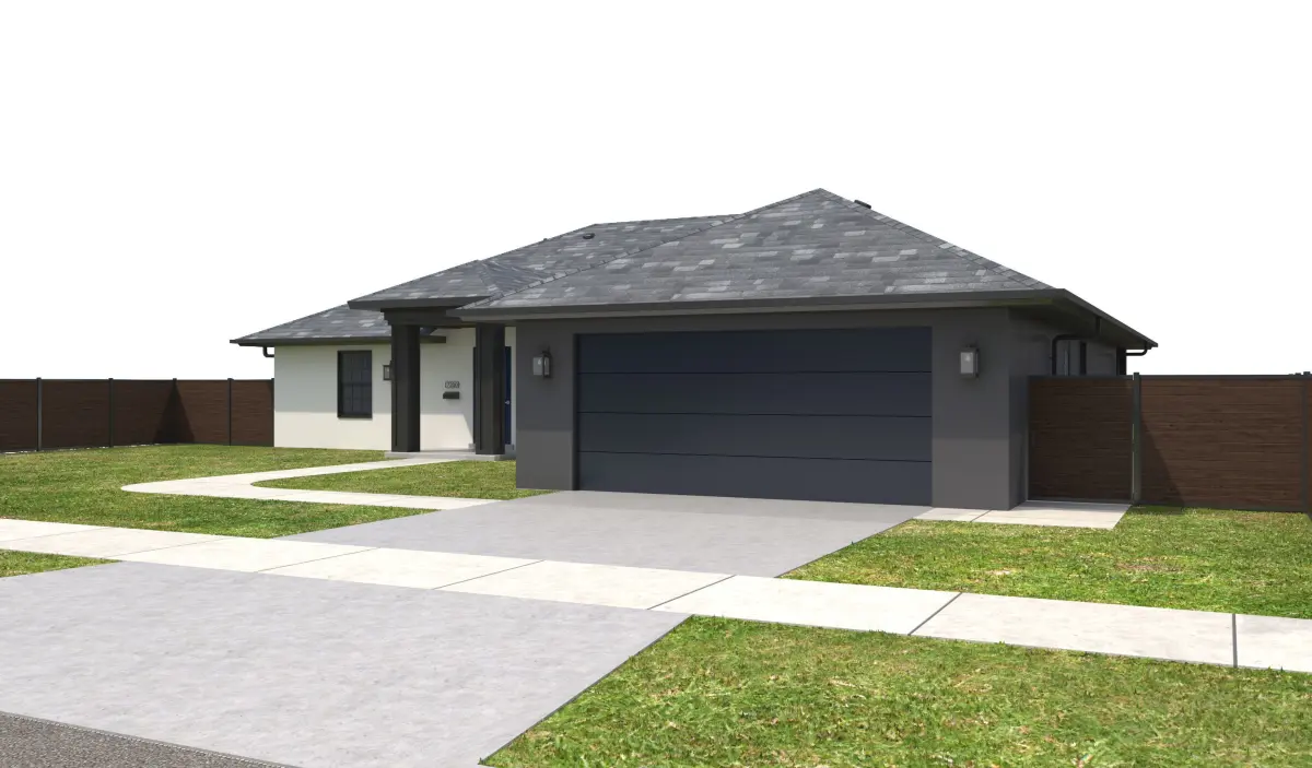 - +/- 2,168 Square Foot 1 story Home with Garage . House has White and Dark Gray Stucco Exterior Walls, Black Window Frames, and Dark Blue Doors. Property has a Dark Wood fence, Dark Blue Garage doors and Black Wood Roof Posts at Entry. Entry Ceiling below roof has wood panels. Windows have Blue shutters at front of house.