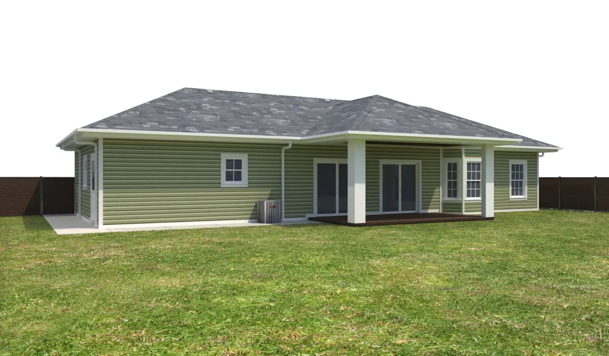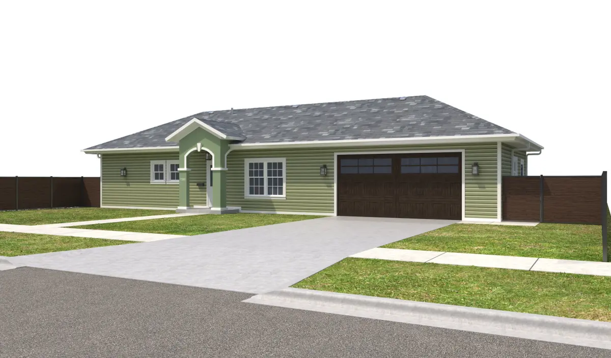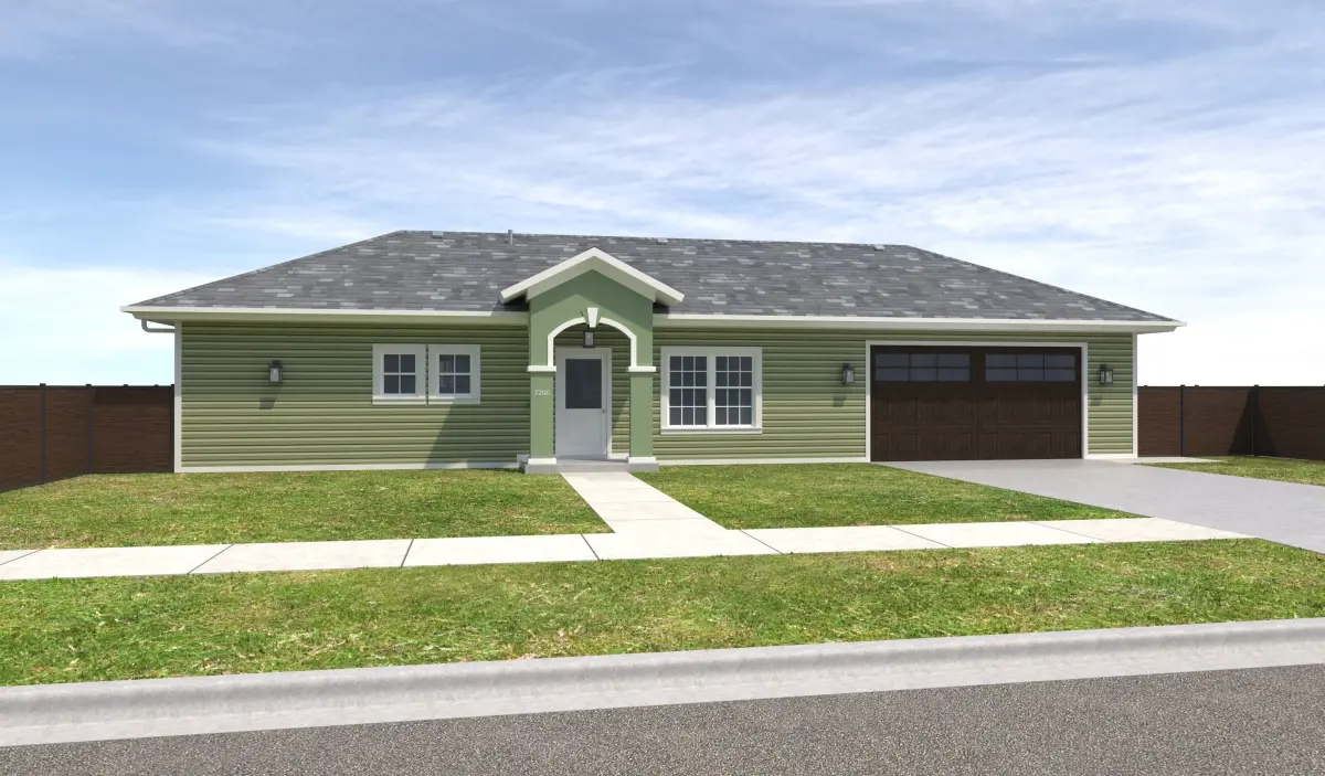 - +/- 1,536 Square Foot 1 story Home with Garage . House has Lime Green Siding Exterior Walls, White Window Frames, and White Doors. Property has a Dark Wood fence, Dark garage doors and a Stucco Eifs Entry. Entry Ceiling below roof has wood panels.