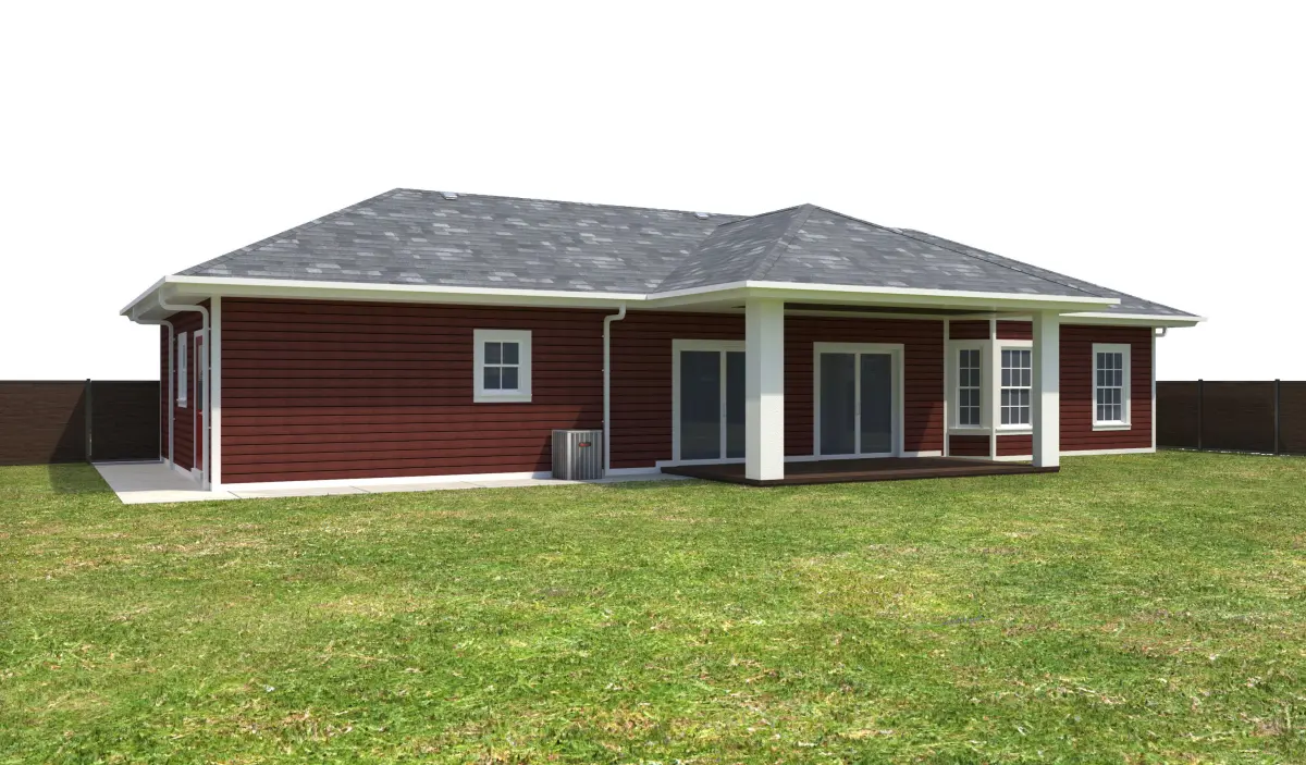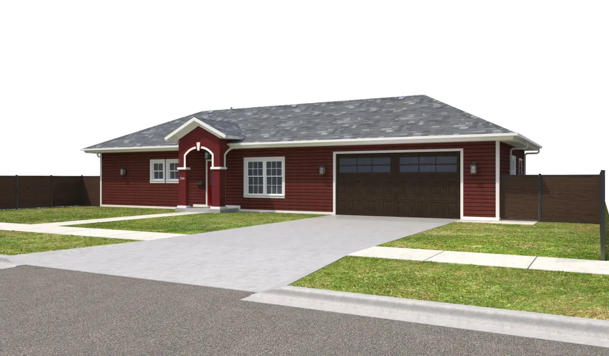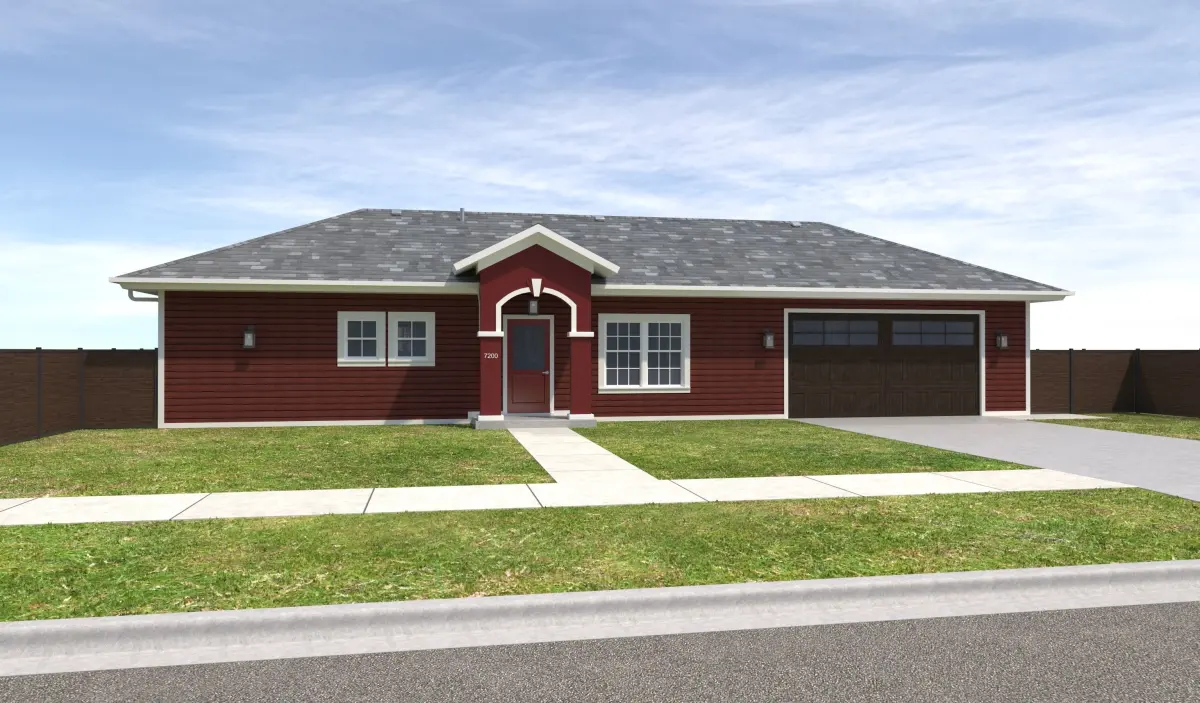 - +/- 1,536 Square Foot 1 story Home with Garage . House has Red Siding Exterior Walls and Red Stucco Entry, White Window Frames, and White Doors. Property has a Dark Wood fence, Dark garage doors. Entry Ceiling below roof has wood panels.