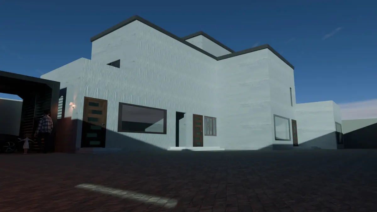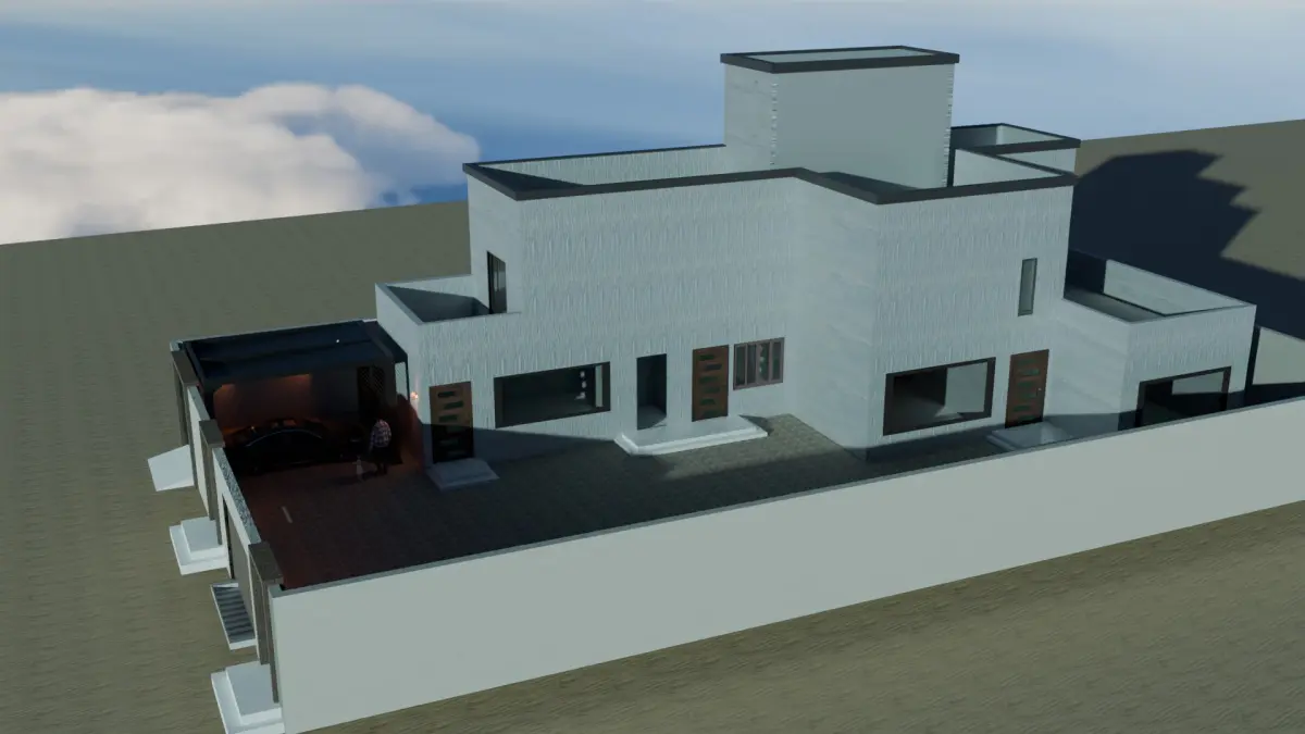 An Arab house with full specifications and sizes, made within 3 days, with furniture for the living room, bedroom, and another room. Colors and materials were added, complete with a Honda car inside the garage