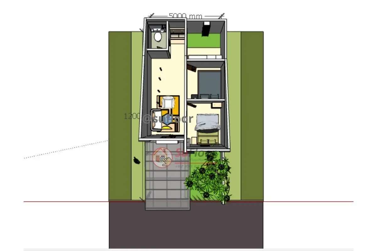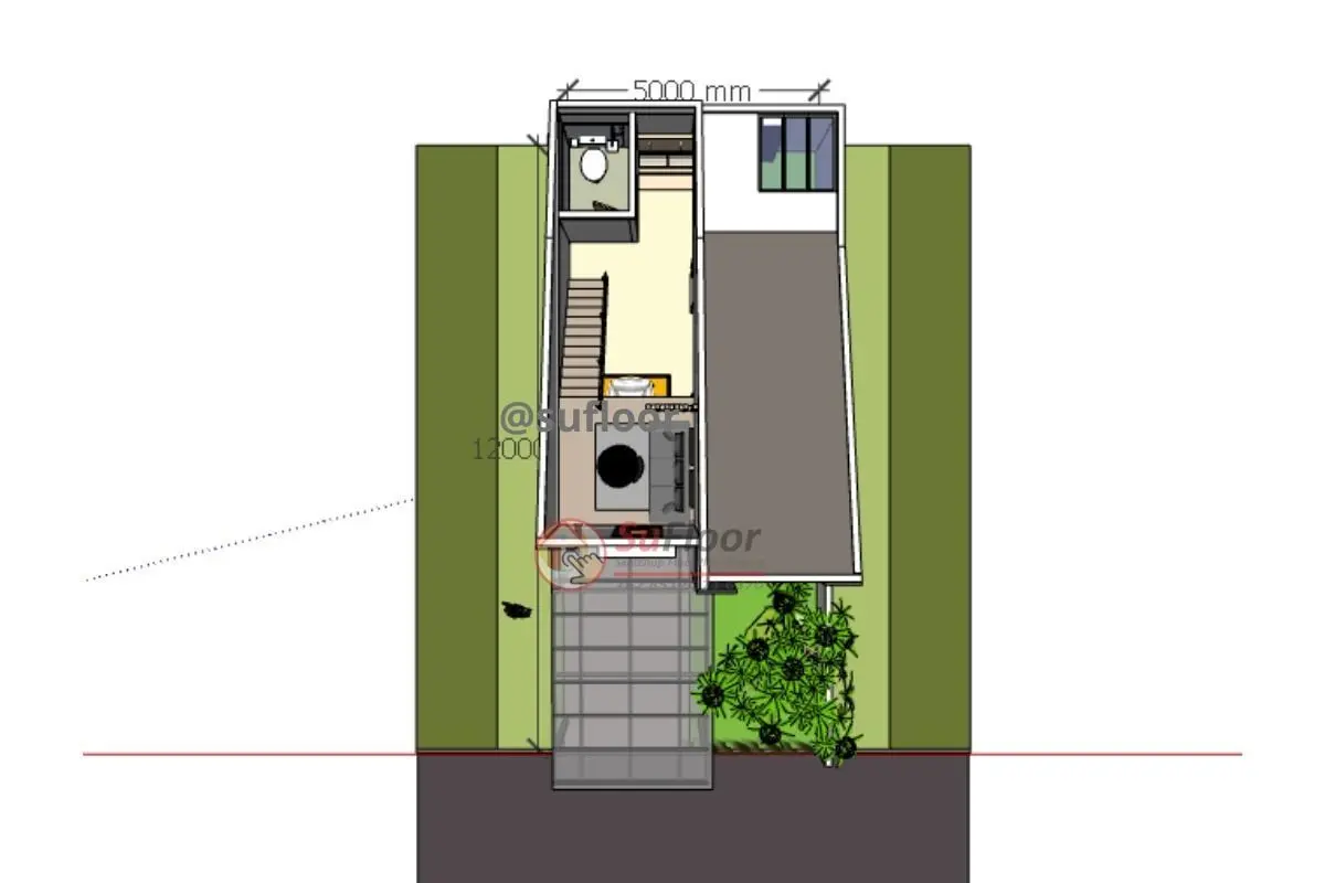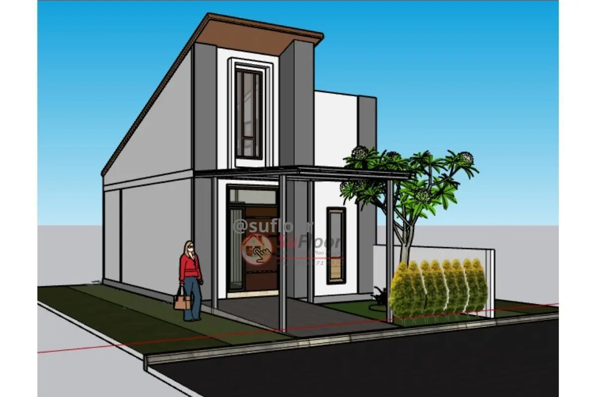 3D Sketchup House 5x12m with : 2 Bedroom,1 bathroom, 1 kitchen, 1 living room, 1 family room, 1 carport