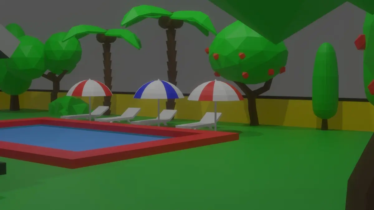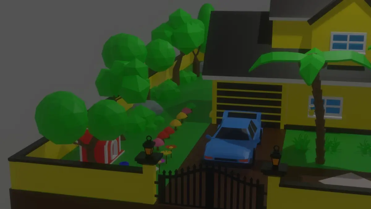 This Model IncludesHouseGarageGarageDoor(Openable and closeable)low poly treeslow poly Sportcar Tree StumpDead TreeColorful MushroomsLampDog HouseDog food PlateGate Door pivot points set for openable and closeableBushWoodenLogPalmCactuspot(for flowers and cactus)colorfulflowersgrasswallpoolrocksBeach UmbrellaBeach Chair