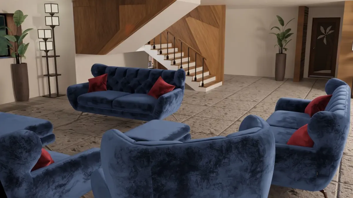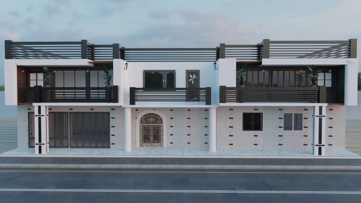 Maison Architecture R+2 avec presque tous les meubles dont : les fauteuils du salon des pots de fleur les meubles du chambre la table à manger la cuisine les lampes de décoration et autres. Elle a de realiste textures matériaux et pbr.