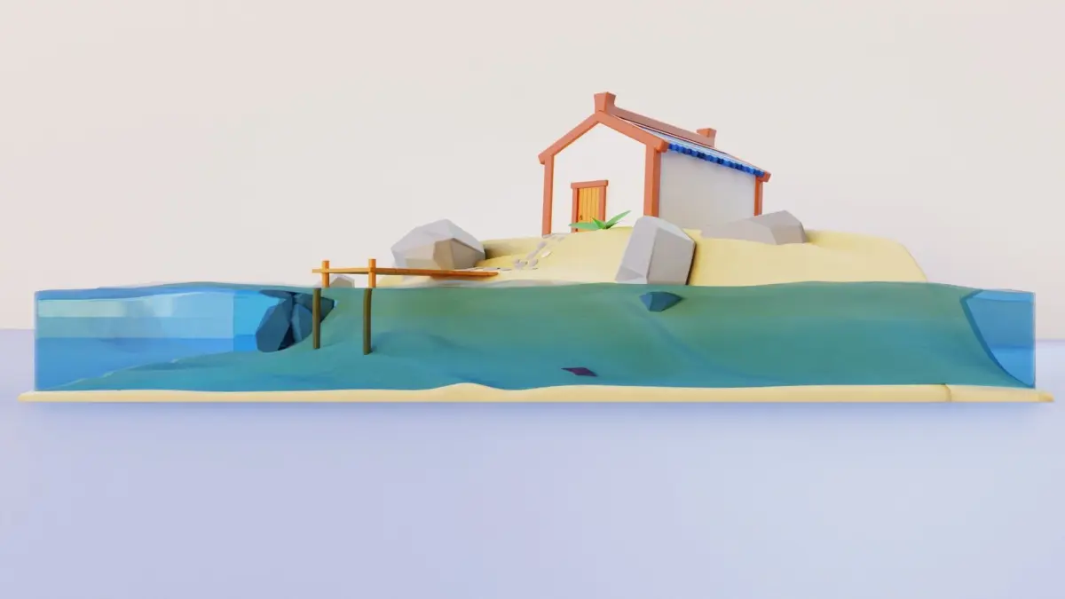 3d model of a house by the sea with a pier.