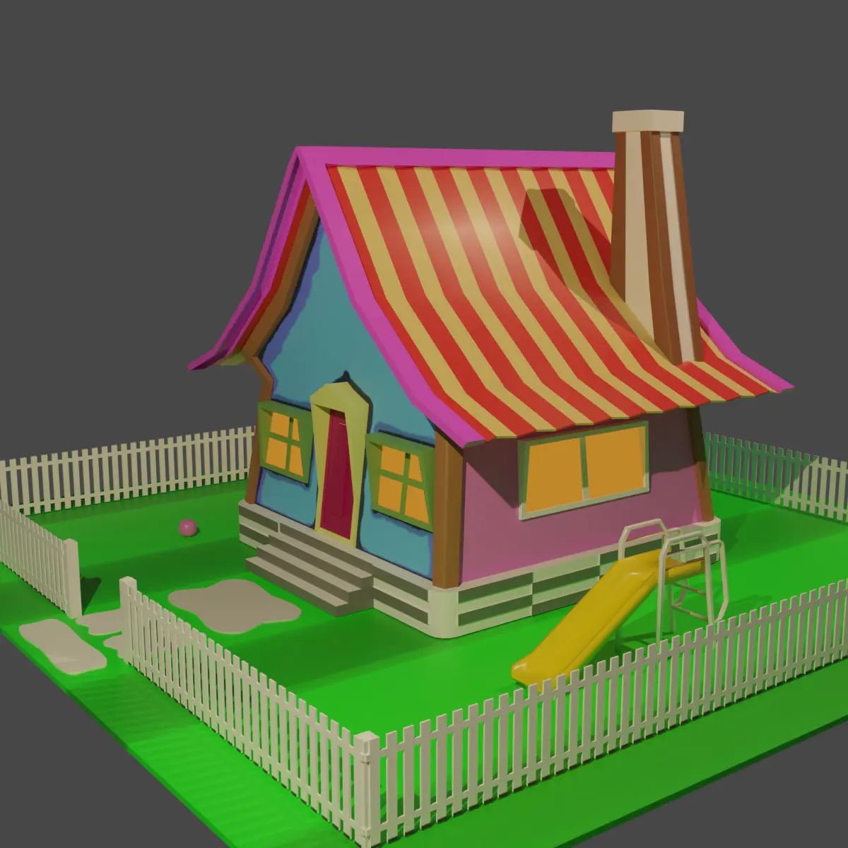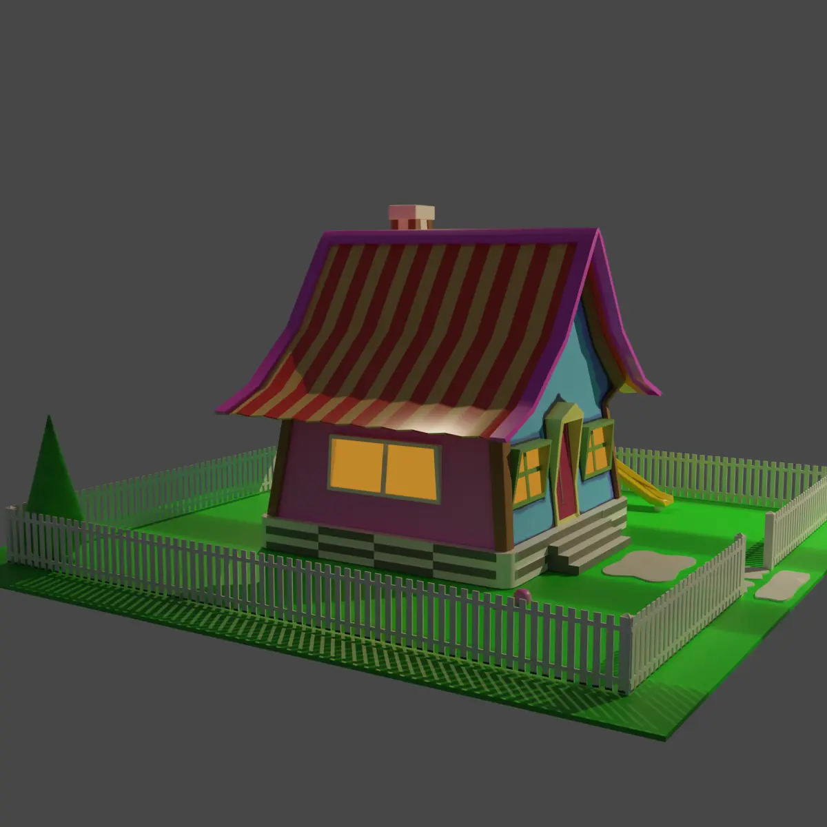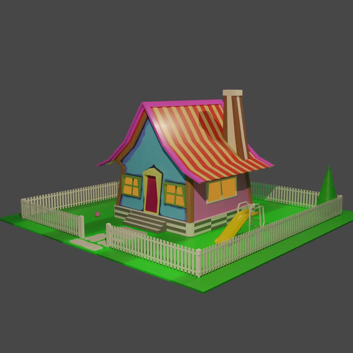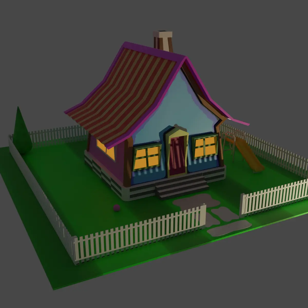 A small project of a cartoon-style house with a slide and a garden with two trees.