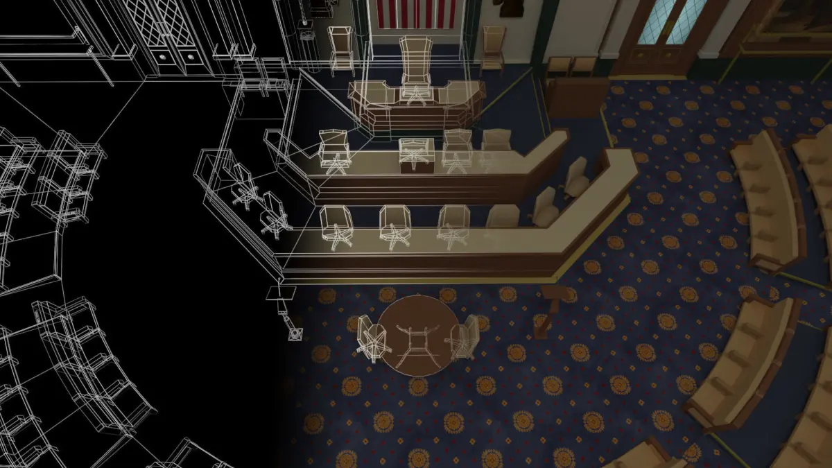 This environment model of the House chamber of the United States House of Representatives is a low poly semi-realistic model suitable for use in games, cartoons, and video. I kept the details simple with a minimum of texture maps in the interest of keeping the model light and fast in game engines, while giving the impression of having all of the detail you would expect to see from the angles commonly shown on TV and in photos. The structure is as accurate as I could make it based on publically available photos of the chamber. Images were rendered in 3DS Max using the ART renderer.