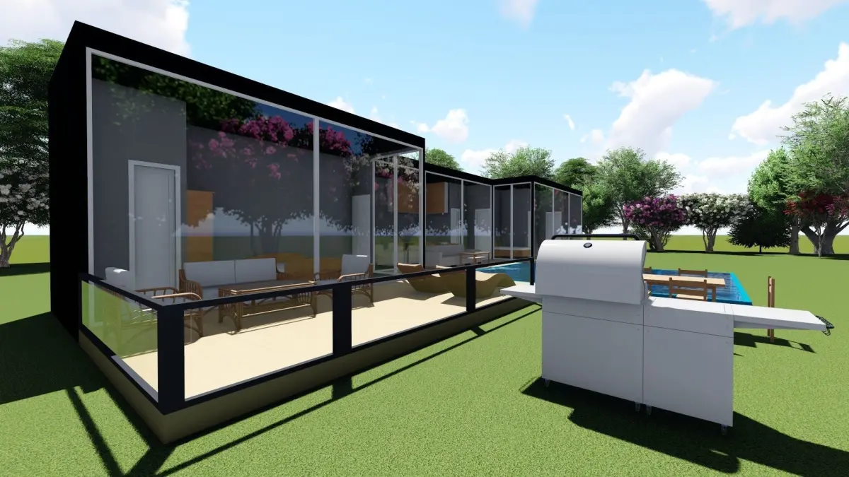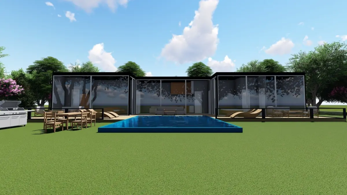 House design has 3 bedroom, livingroom and kitchen. House has a big pool and outer living area.