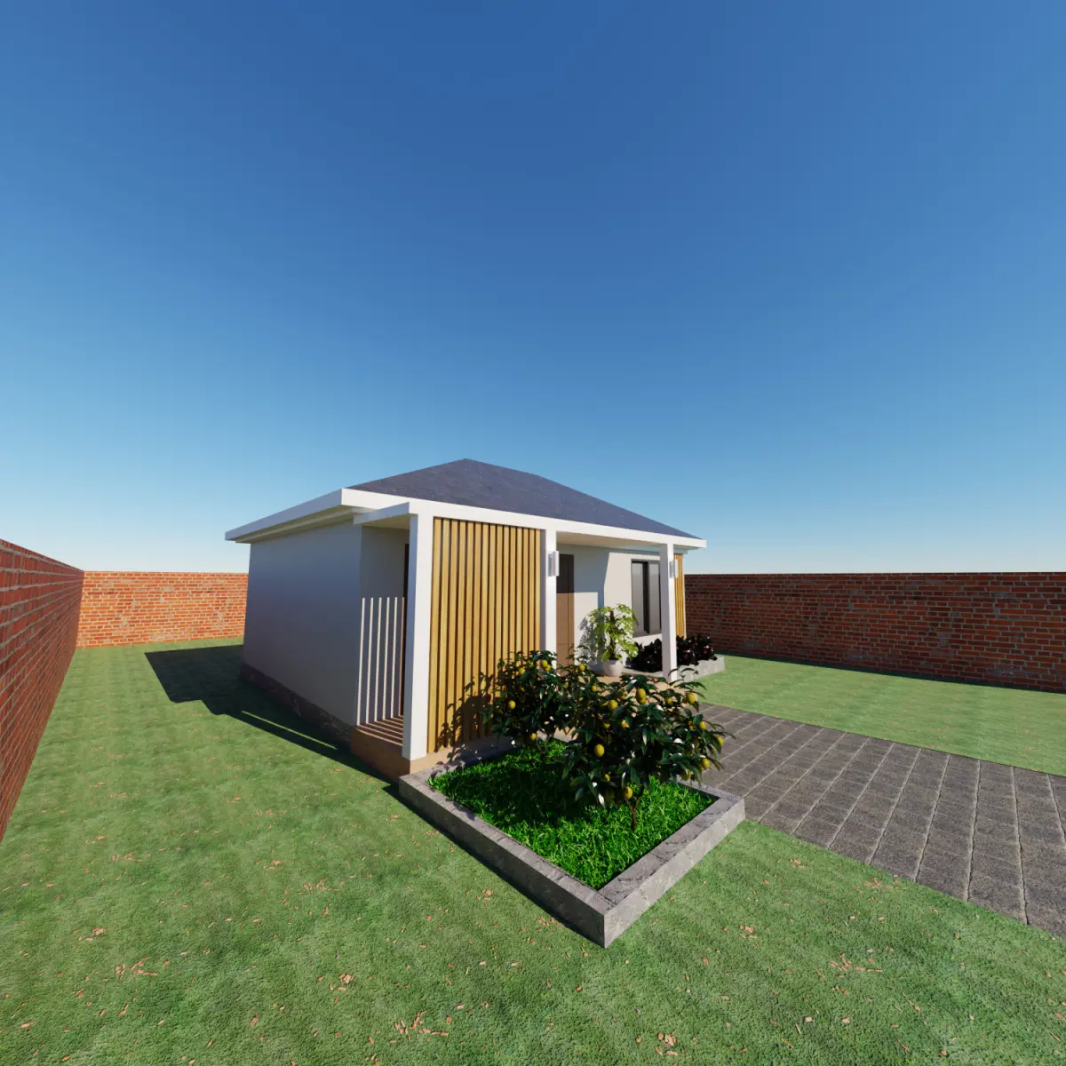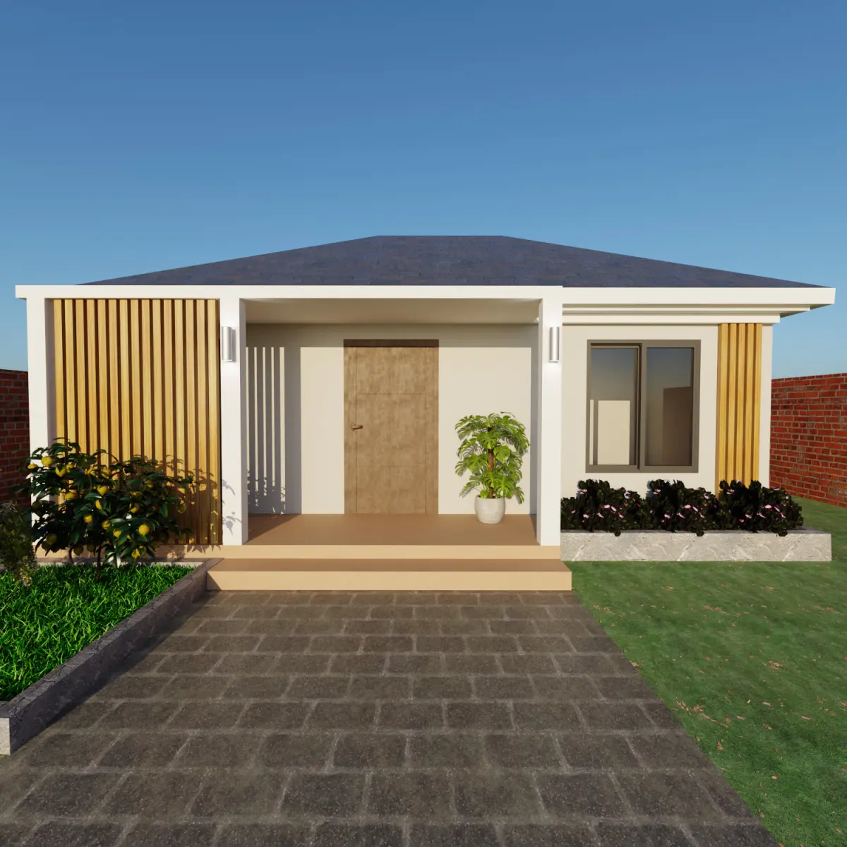 This 3D-rendered model showcases a modern, minimalist single-story house with a well-balanced design, featuring a combination of warm and neutral tones that enhance its aesthetic appeal. The house is surrounded by a green lawn and well-maintained landscaping, contributing to a welcoming atmosphere.
