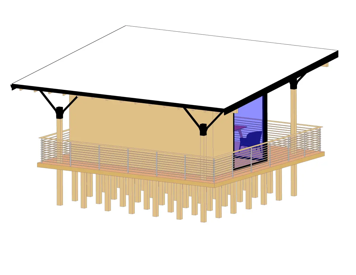 - Technical Details:Structure: Wooden piles (6x6), laminated beams, guayubira decking.