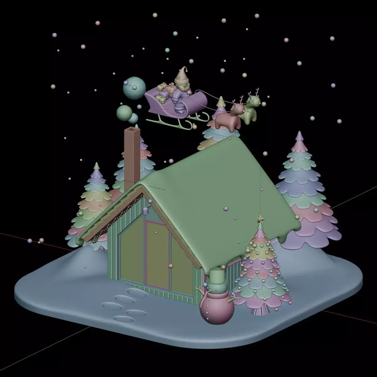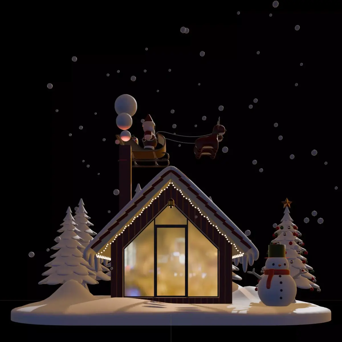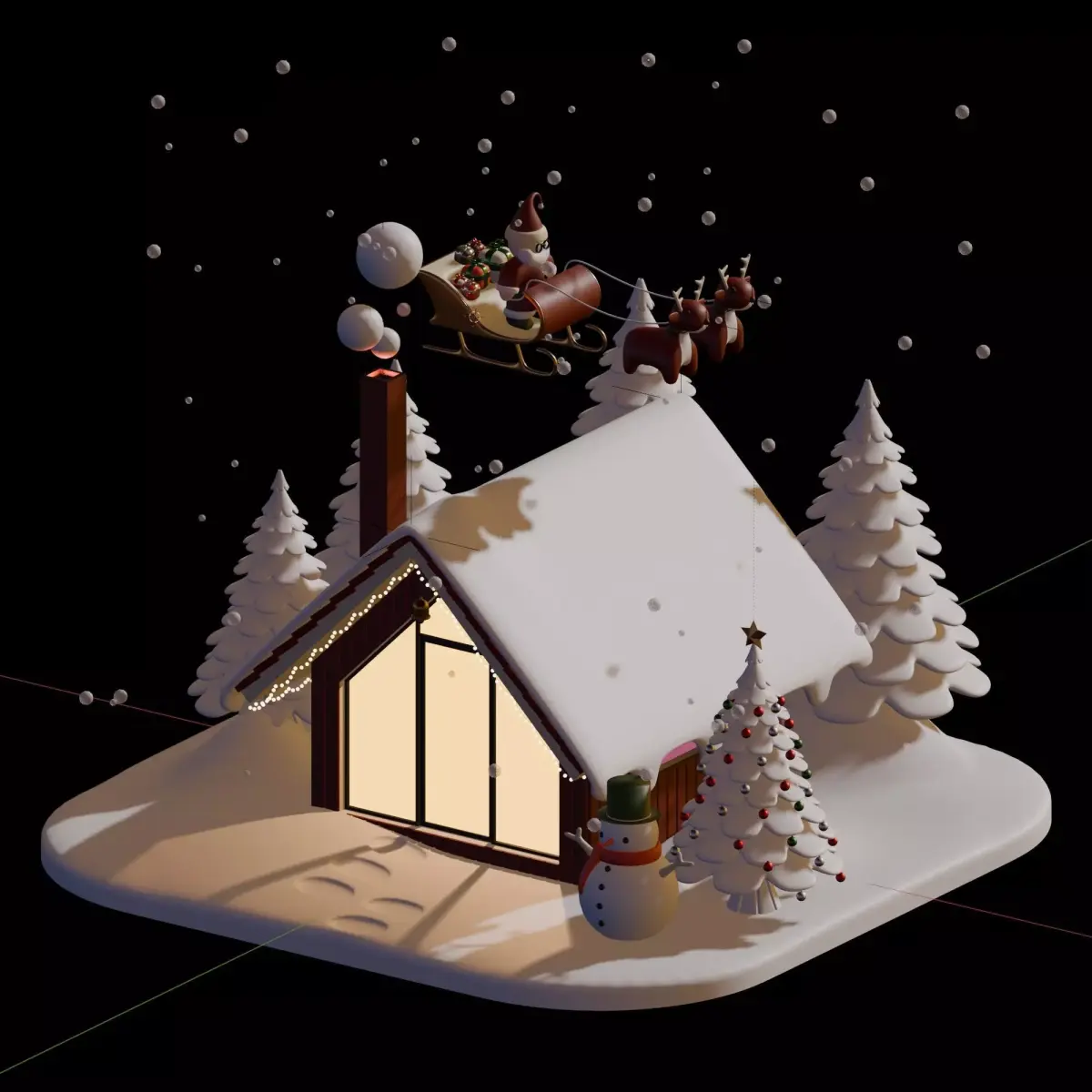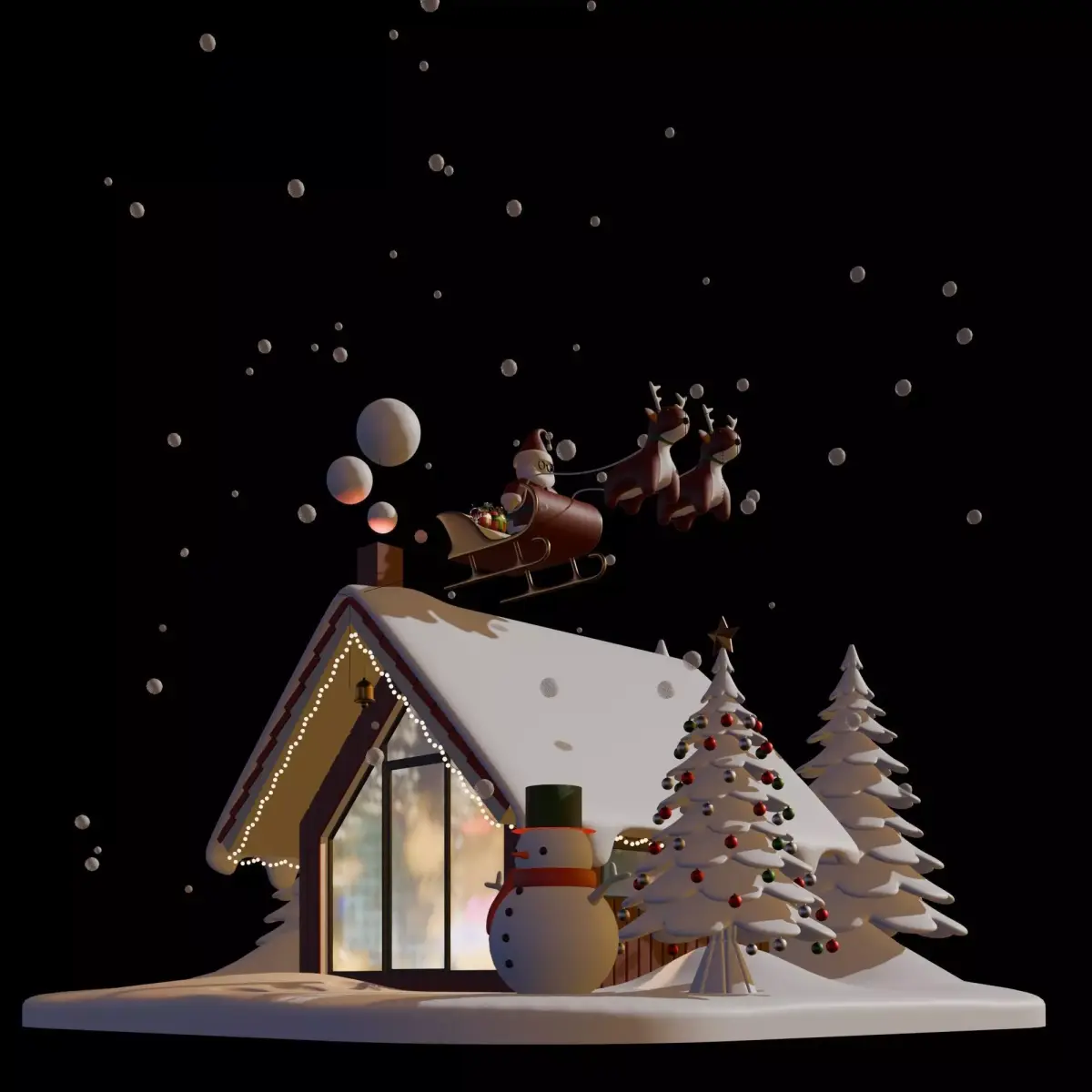 House In Winter Christmas 3D render illustration. including a house building, a christmas tree, a snowman, and santa riding sleigh with two flying deer, in a snowy environtment.Originally made in Blender, also available in .OBJ and .FBX file format.