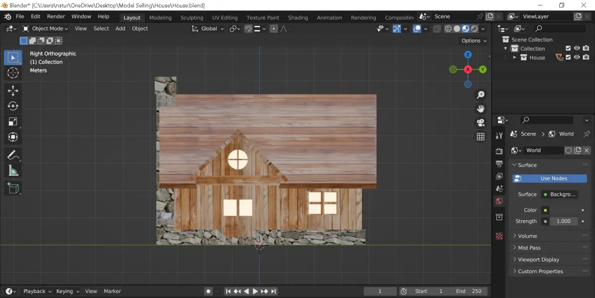 A textured house with all the details like the windows, the doors, roofs, and so on, but at the same time with a simple mesh. The light shining out of the door and the windows is made with the shader node emission, but to see better results in Eevee, area lights can be used.The texture files are available in the package.