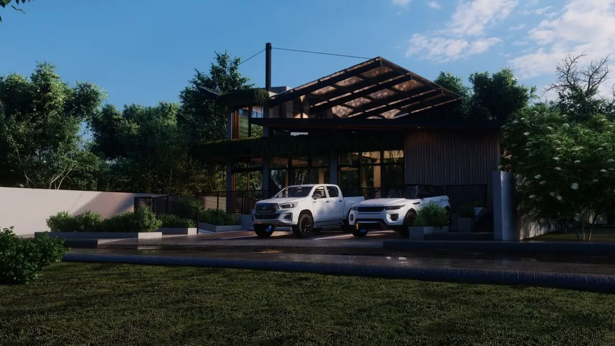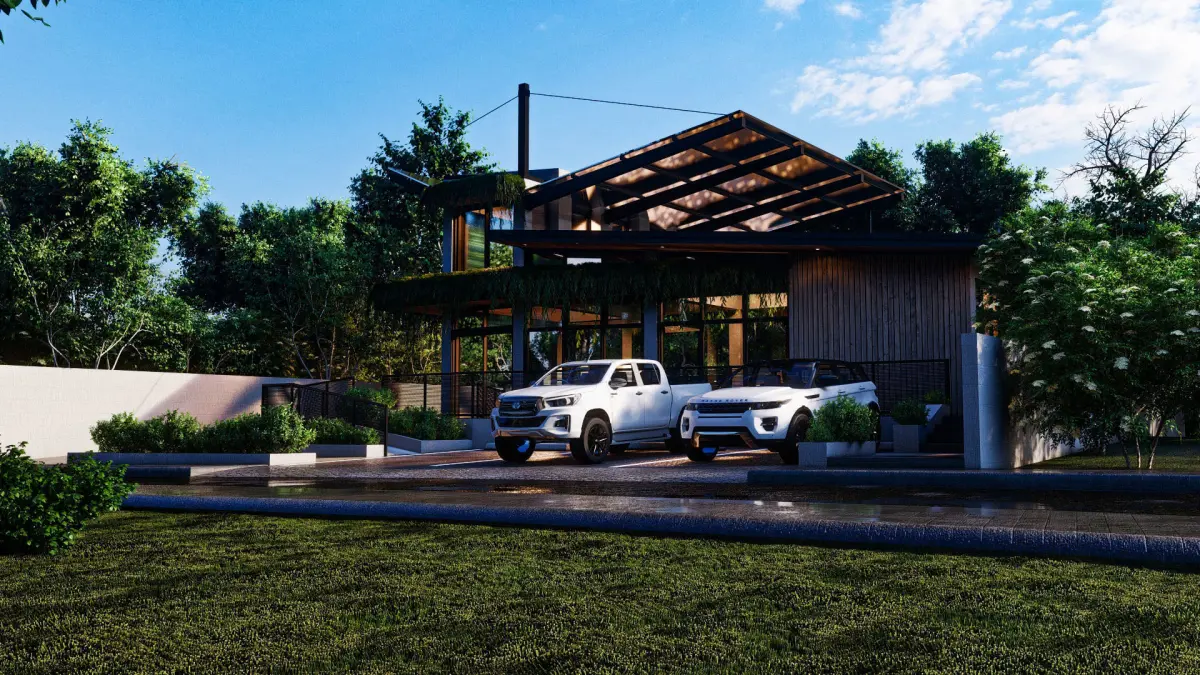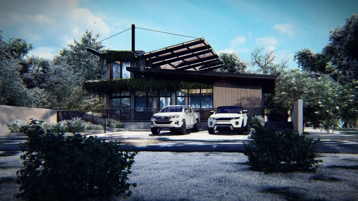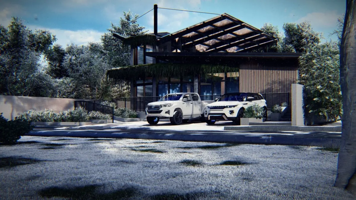 As you approach the house, you're greeted by clean lines and geometric shapes that define its modern aesthetic. The exterior facade features a mix of materials, including smooth concrete, glass panels, and natural wood accents. Large floor-to-ceiling windows not only flood the interior with natural light but also provide panoramic views of the surrounding landscape.